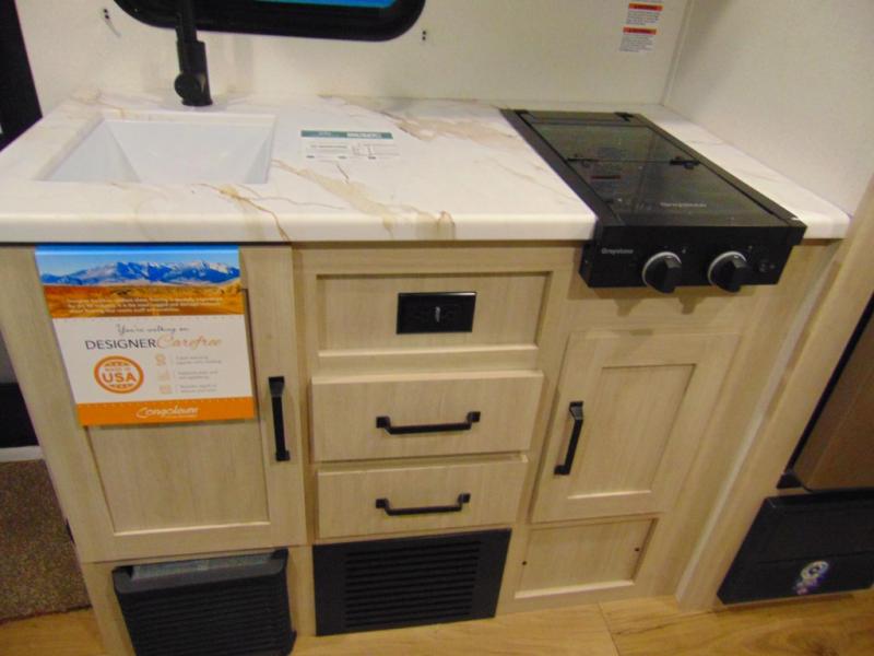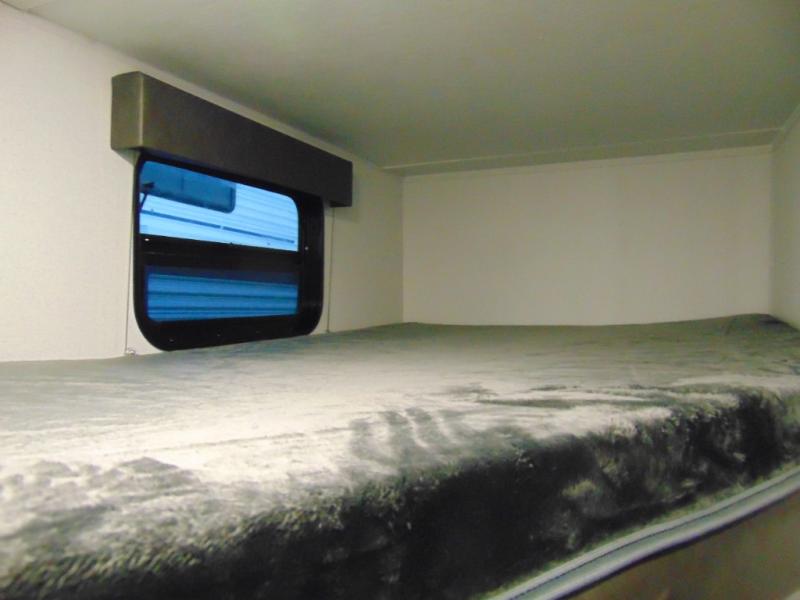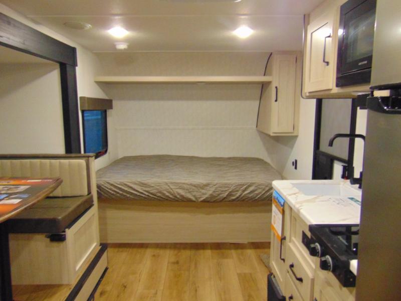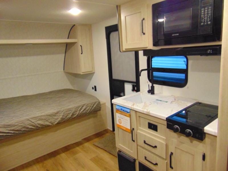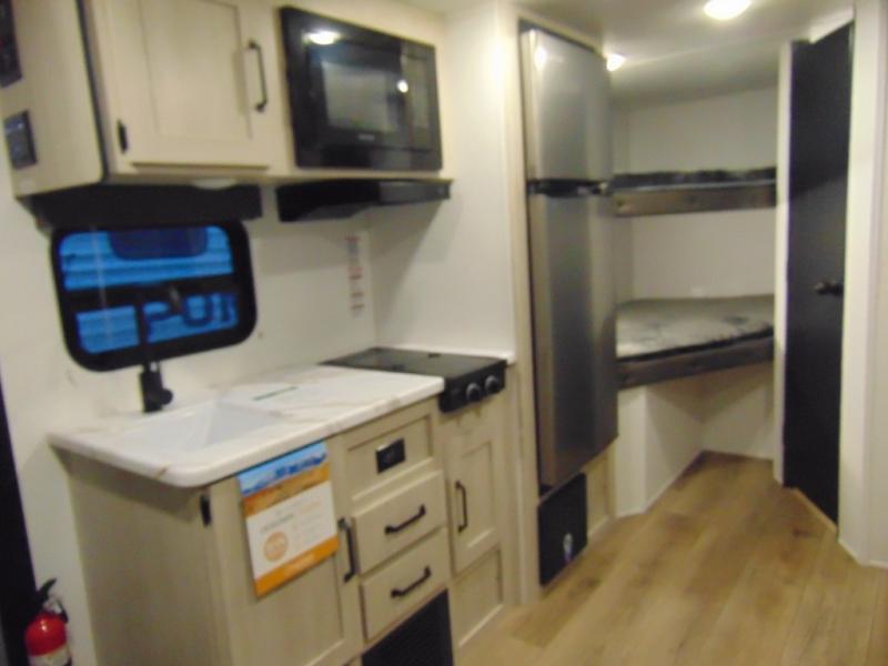 The whole gang will love camping in this travel trailer since there are double-size bunks for compact sleeping spaces and a slide out for more space to relax! The front RV queen bed is sure to provide a great night's rest, and you can choose the optional Murphy bed if you're needing more seating space during the day. Once you've made dinner on the two burner cooktop, you can dine around the U-shaped dinette. And an optional mini kitchen with a griddle is available if you'd rather cook outdoors! This unit includes ample storage space for your things, including exterior storage and storage under the bunks!