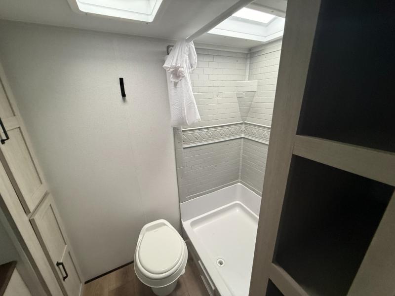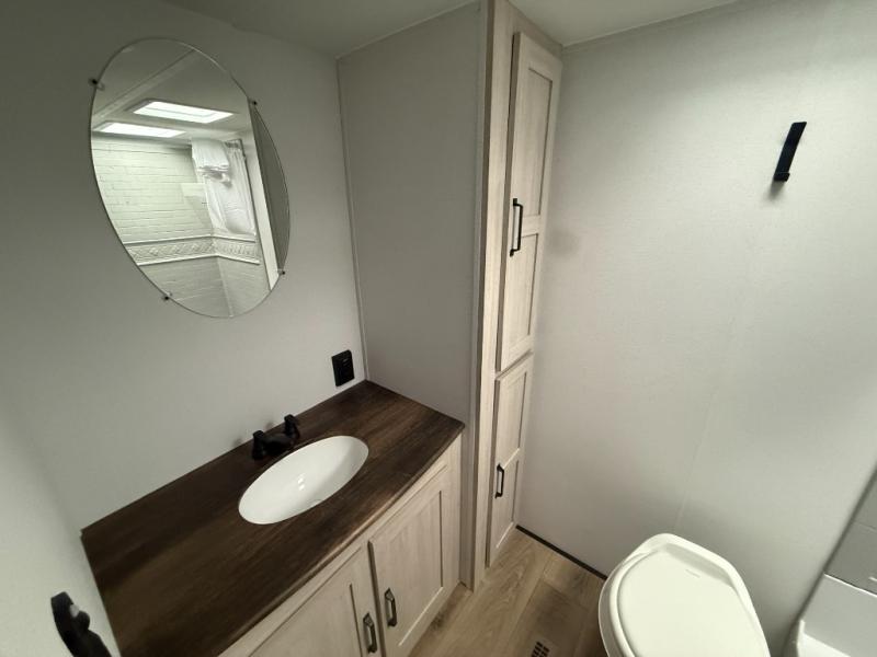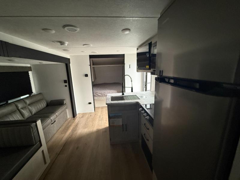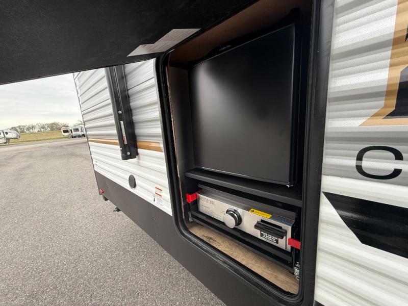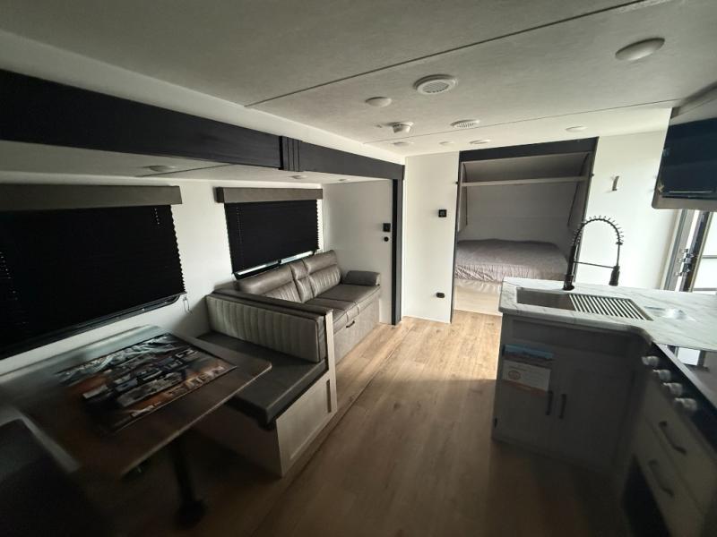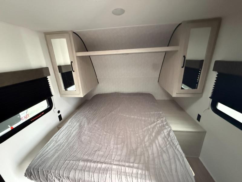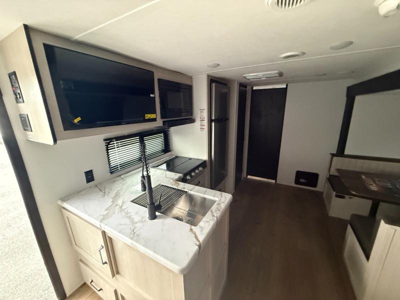 Wherever you decide to camp, you can be sure to have a great time in this rear bath travel trailer! The combined kitchen and living area is made spacious thanks to the large slide out. Here, you can relax on the sofa and dine at the booth dinette, and an optional TV can be added if you want the option for movie night. The full kitchen will allow you to make meals each day, and you can choose to add the optional outside mini kitchen with a griddle if you want to cook with fresh air. This unit also includes a front private bedroom, complete with an RV queen bed, an overhead shelf and dual shirt closets to keep clothes wrinkle-free.