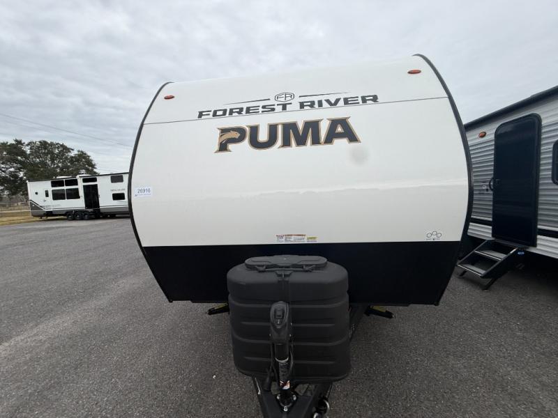 The Puma Camping Edition by Palomino offer an affordable travel trailer for rookie campers or seasoned RVers! They are built with 5/8" tongue and groove plywood flooring and a front diamond plate for added protection. There are also exterior clamp style door latches, back up camera prep, and 20 lb. LP bottles. Head inside to find Thermofoil countertops with a smooth drop edge, bedroom USB ports and outlets, and a GE appliance and kitchen package.