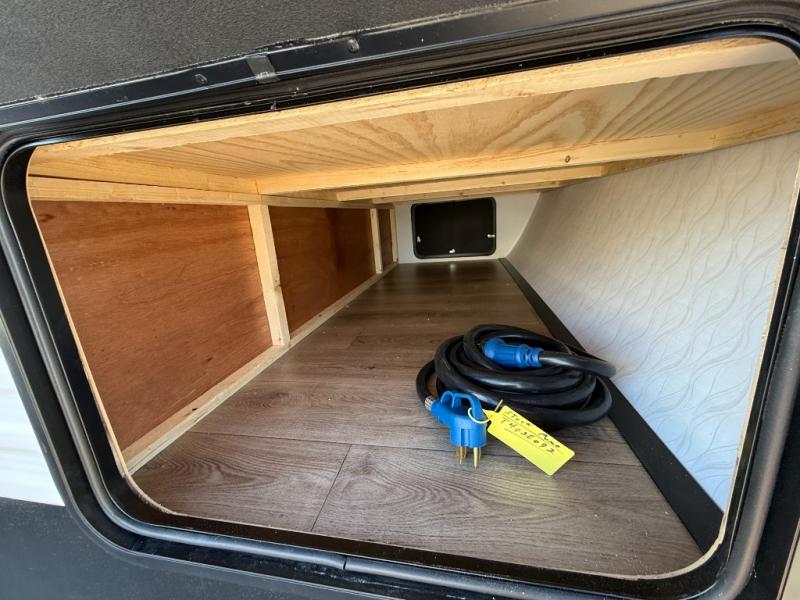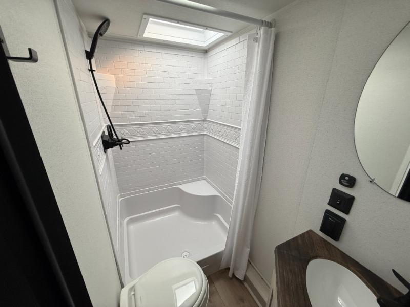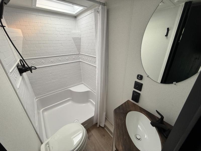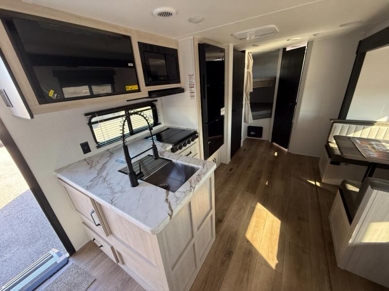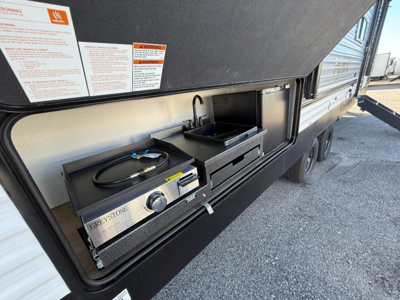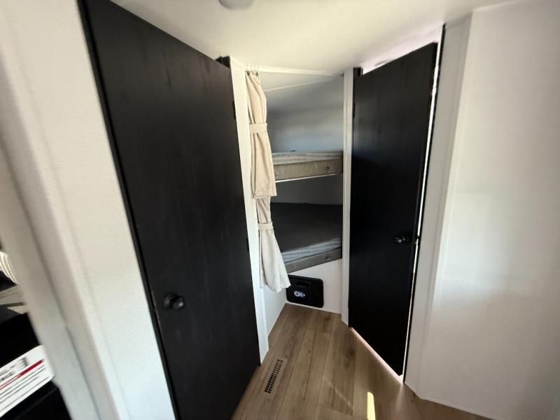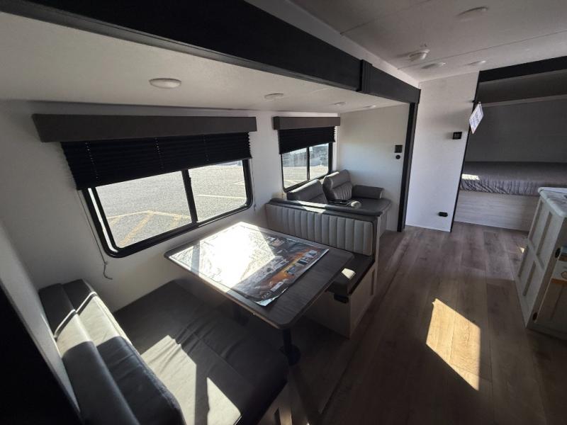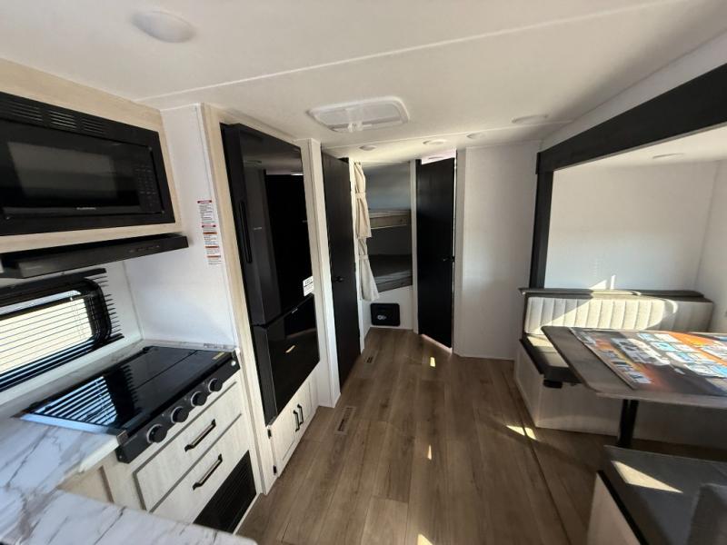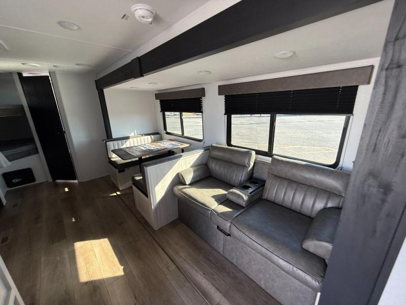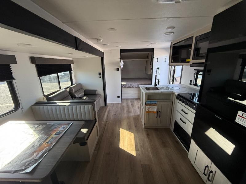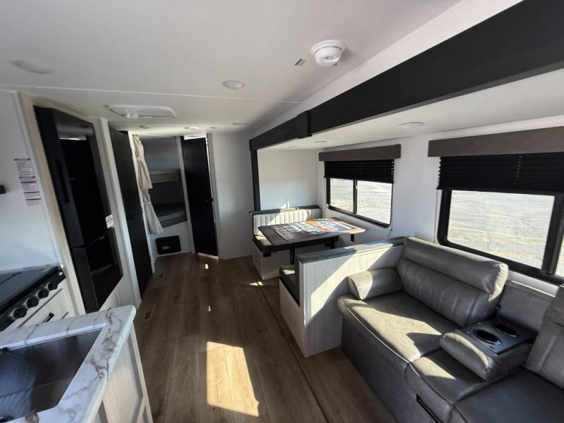If you're looking for more space, this double axle unit features a large slide so you can walk about freely. Here, you'll find the booth dinette and sofa, which sit across from the optional TV if you want to enjoy movie nights. The full kitchen includes a stainless microwave and three burner cooktop to make meals, plus a pantry and 12V refrigerator for food storage. And an optional outside kitchen with a griddle can be added if you enjoy cooking outdoors! The kids or your guests will love the double-size bunks, and the full bath right beside the bunks includes a shower a seat for added comfort.