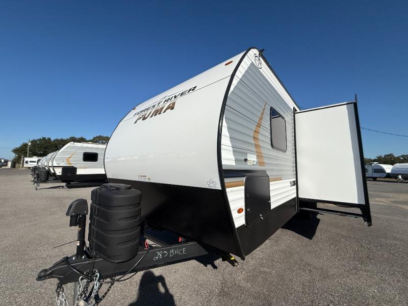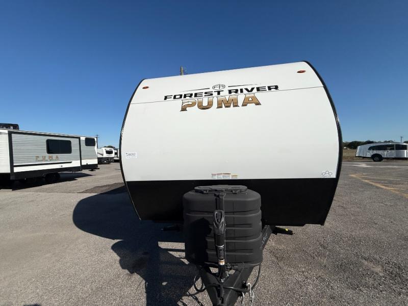 The Puma Camping Edition by Palomino offer an affordable travel trailer for rookie campers or seasoned RVers! They are built with 5/8" tongue and groove plywood flooring and a front diamond plate for added protection. There are also exterior clamp style door latches, back up camera prep, and 20 lb. LP bottles. Head inside to find Thermofoil countertops with a smooth drop edge, bedroom USB ports and outlets, and a GE appliance and kitchen package.