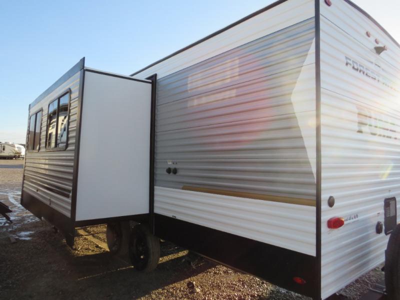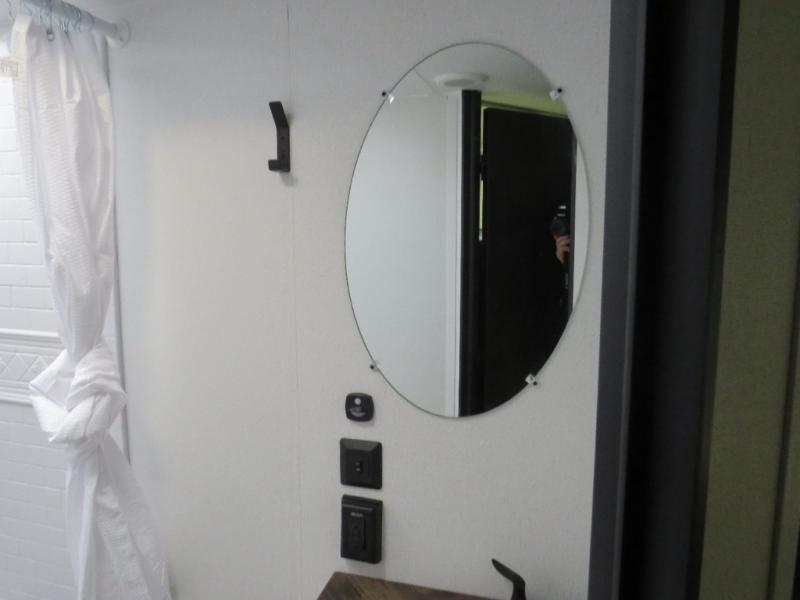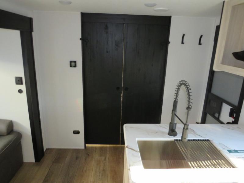 If you're looking for more space, this double axle unit features a large slide so you can walk about freely. Here, you'll find the booth dinette and sofa, which sit across from the optional TV if you want to enjoy movie nights. The full kitchen includes a stainless microwave and three burner cooktop to make meals, plus a pantry and 12V refrigerator for food storage. And an optional outside kitchen with a griddle can be added if you enjoy cooking outdoors! The kids or your guests will love the double-size bunks, and the full bath right beside the bunks includes a shower a seat for added comfort.