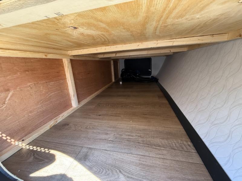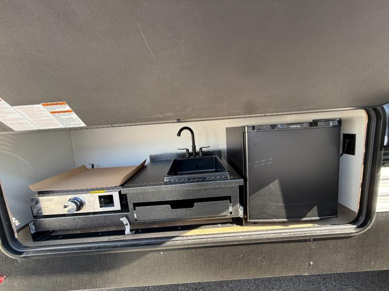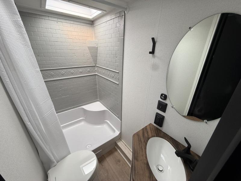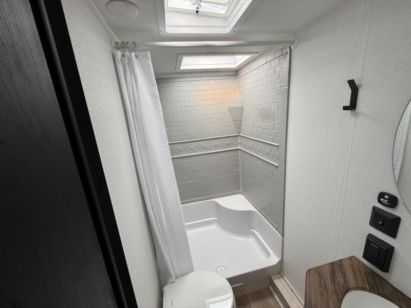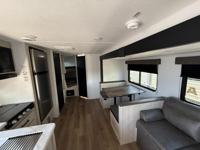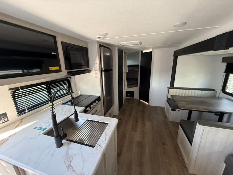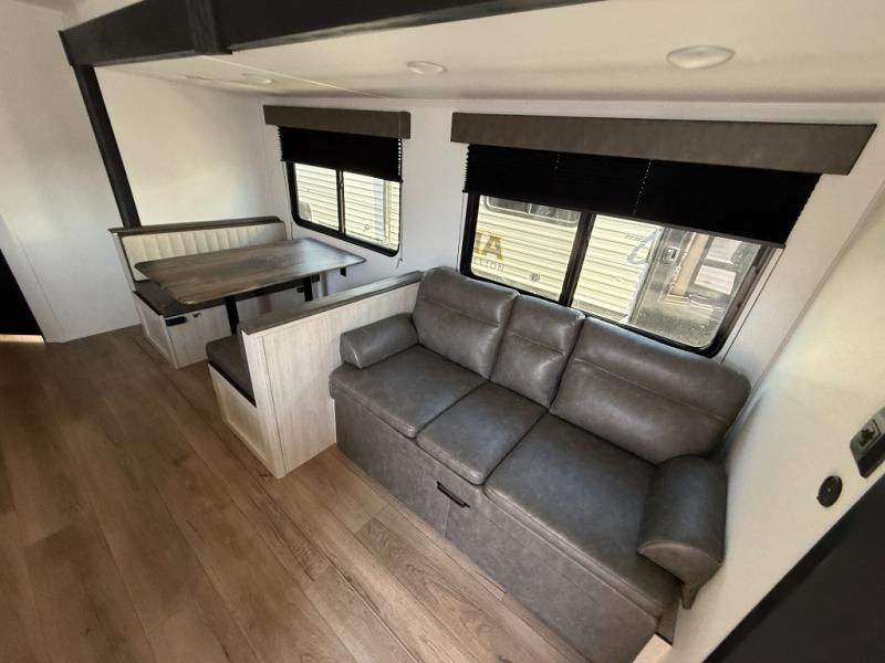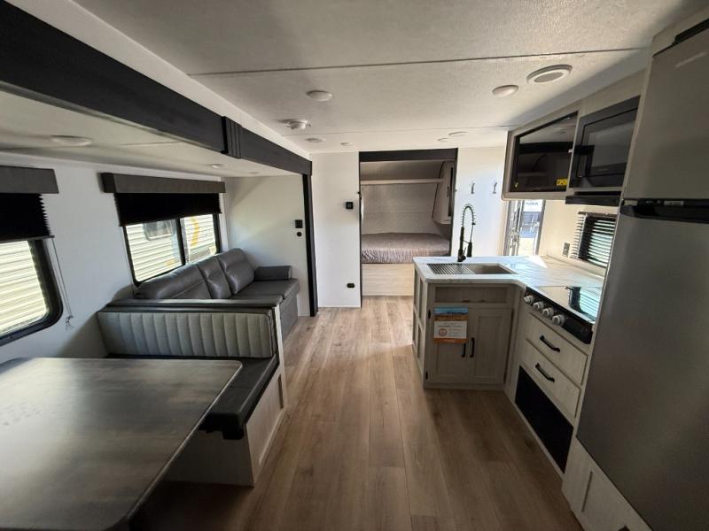 If you're looking for more space, this double axle unit features a large slide so you can walk about freely. Here, you'll find the booth dinette and sofa, which sit across from the optional TV if you want to enjoy movie nights. The full kitchen includes a stainless microwave and three burner cooktop to make meals, plus a pantry and 12V refrigerator for food storage. And an optional outside kitchen with a griddle can be added if you enjoy cooking outdoors! The kids or your guests will love the double-size bunks, and the full bath right beside the bunks includes a shower a seat for added comfort.