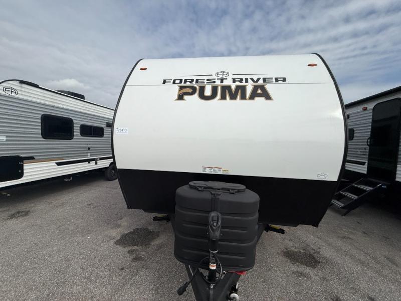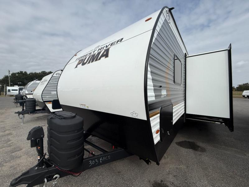 The Puma Camping Edition by Palomino offer an affordable travel trailer for rookie campers or seasoned RVers! They are built with 5/8" tongue and groove plywood flooring and a front diamond plate for added protection. There are also exterior clamp style door latches, back up camera prep, and 20 lb. LP bottles. Head inside to find Thermofoil countertops with a smooth drop edge, bedroom USB ports and outlets, and a GE appliance and kitchen package.