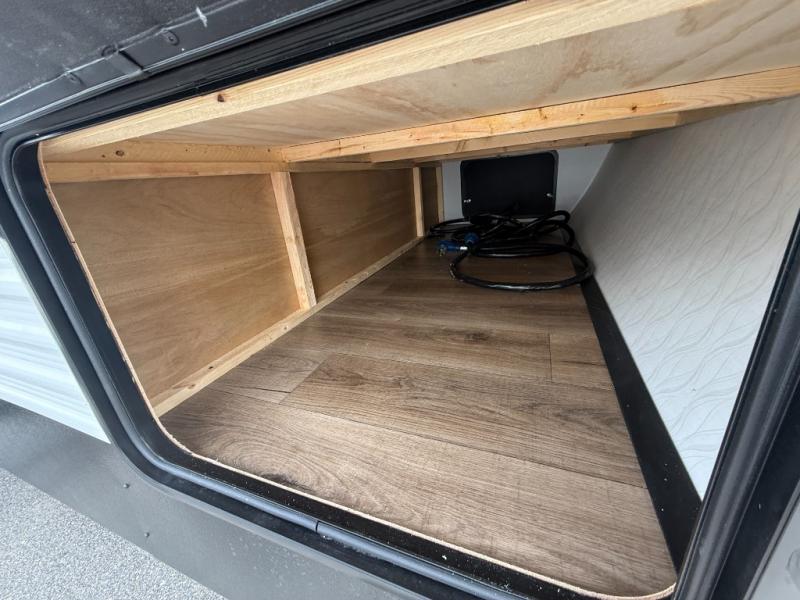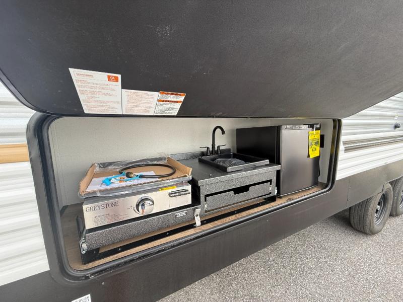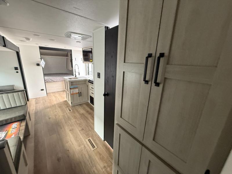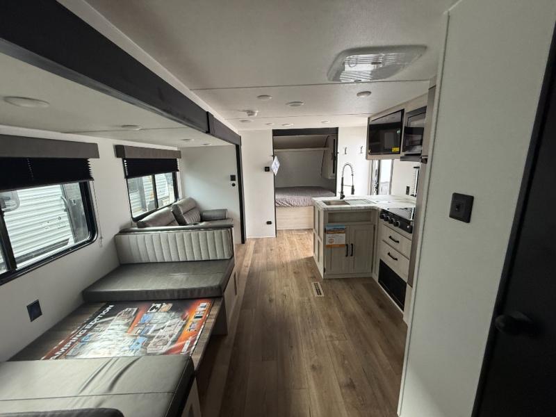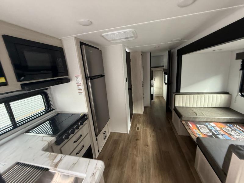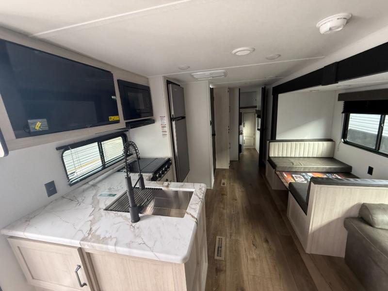 If you're looking for more space, this double axle unit features a large slide so you can walk about freely. Here, you'll find the booth dinette and sofa, which sit across from the optional TV if you want to enjoy movie nights. The full kitchen includes a stainless microwave and three burner cooktop to make meals, plus a pantry and 12V refrigerator for food storage. And an optional outside kitchen with a griddle can be added if you enjoy cooking outdoors! Your guests or littles are sure to enjoy the rear private bunkhouse with four bunk beds and a wardrobe for their things!