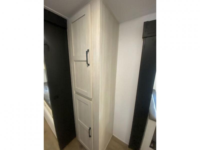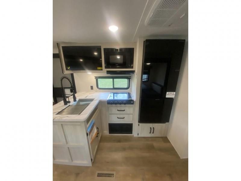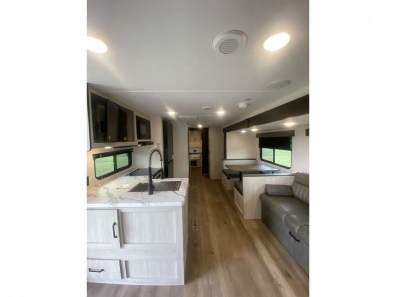 If you're looking for more space, this double axle unit features a large slide so you can walk about freely. Here, you'll find the booth dinette and sofa, which sit across from the optional TV if you want to enjoy movie nights. The full kitchen includes a stainless microwave and three burner cooktop to make meals, plus a pantry and 12V refrigerator for food storage. And an optional outside kitchen with a griddle can be added if you enjoy cooking outdoors! Your guests or littles are sure to enjoy the rear private bunkhouse with four bunk beds and a wardrobe for their things!