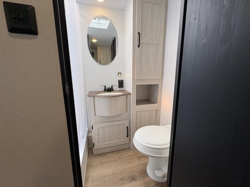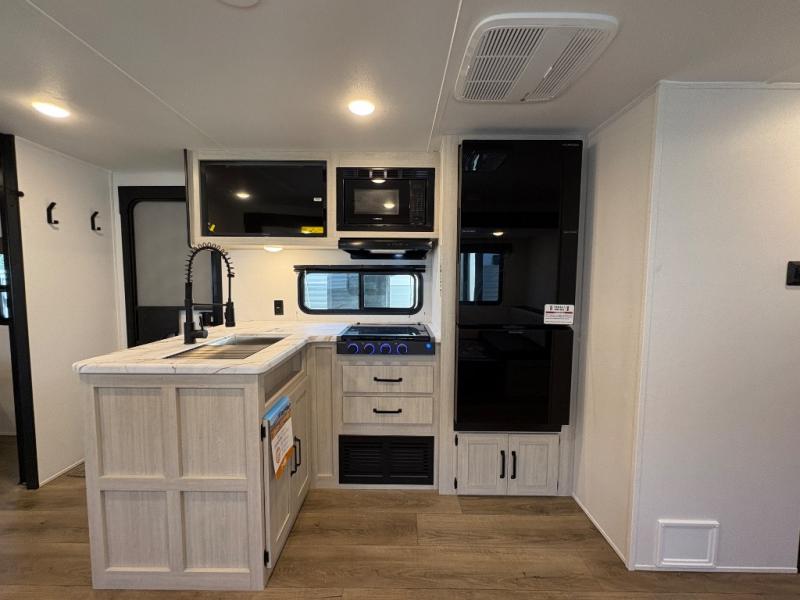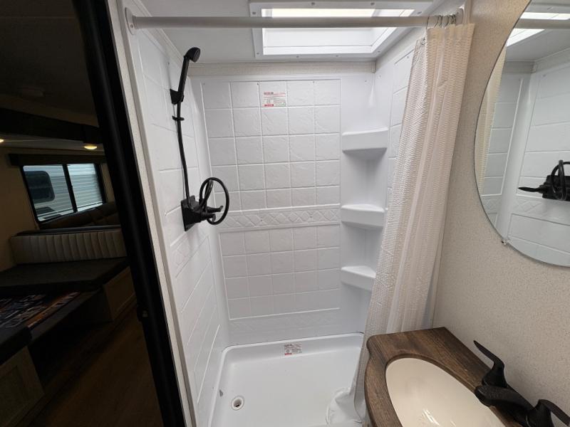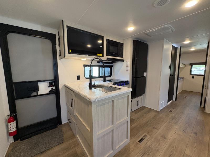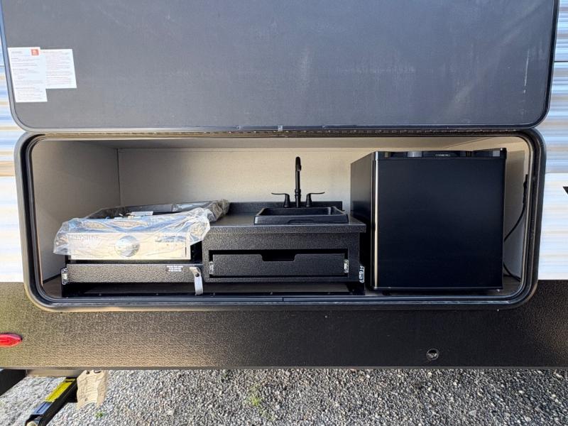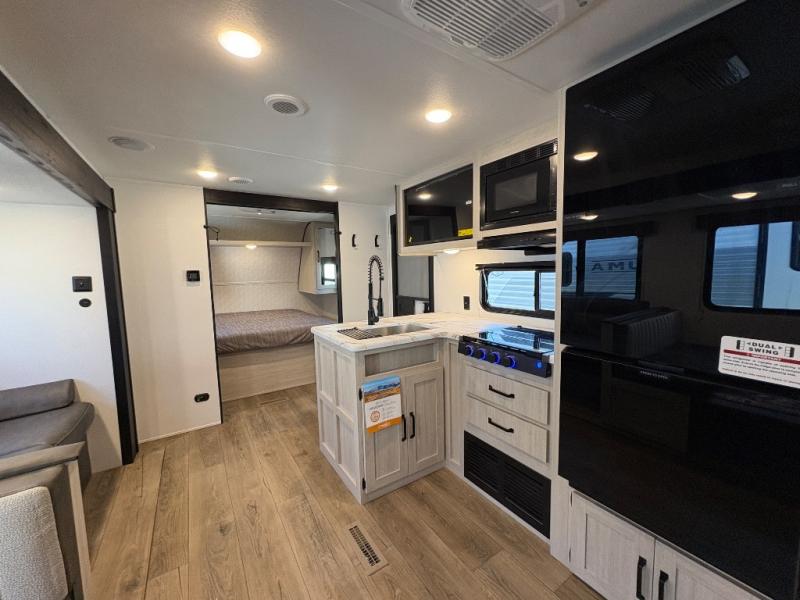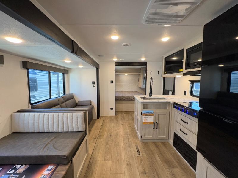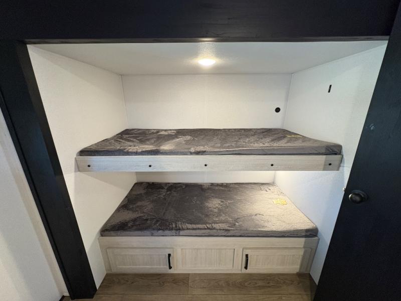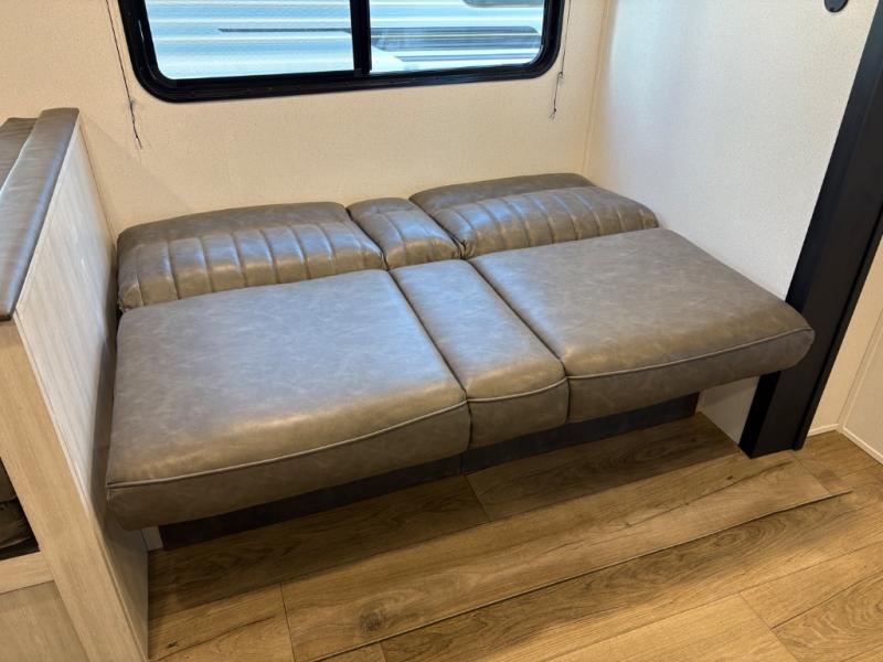 If you're looking for more space, this double axle, double slide out unit is perfect for your group of eight. Within the large slide in the living room, you'll find the booth dinette and sofa, which sit across from the optional TV if you want to enjoy movie nights. The full kitchen includes a stainless microwave and three burner cooktop to make meals, plus a pantry and 12V refrigerator for food storage. And an optional outside kitchen with a griddle can be added if you enjoy cooking outdoors! Your guests or littles are sure to enjoy the rear private bunkhouse that features a set of 38" x 76" bunks across from the third bunk and jiffy sofa within a slide out!
