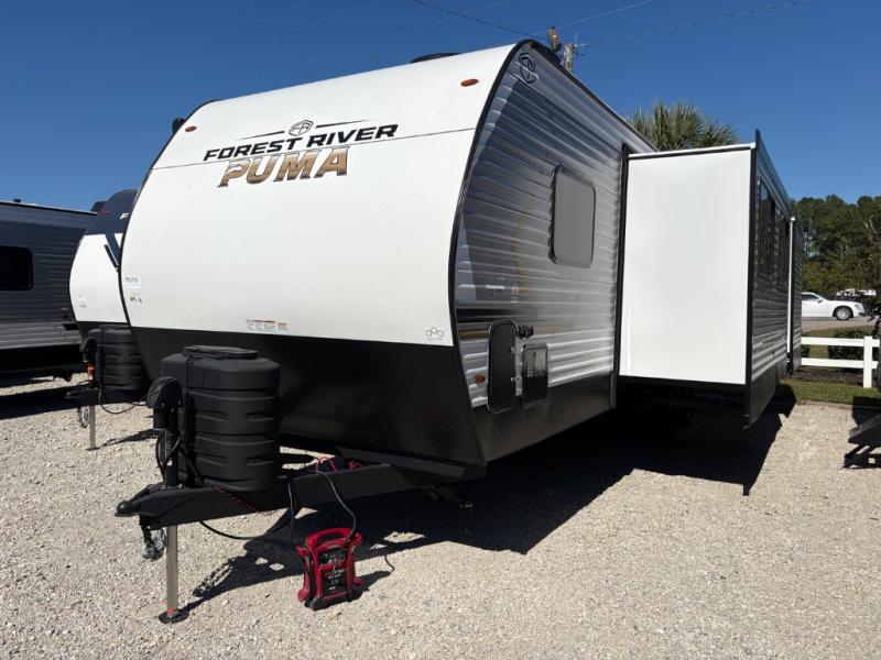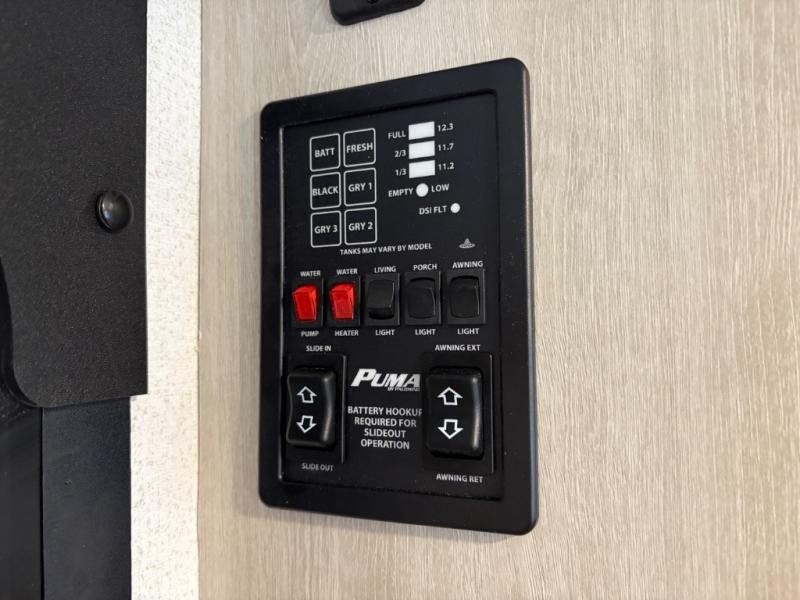 The Puma Camping Edition by Palomino offer an affordable travel trailer for rookie campers or seasoned RVers! They are built with 5/8" tongue and groove plywood flooring and a front diamond plate for added protection. There are also exterior clamp style door latches, back up camera prep, and 20 lb. LP bottles. Head inside to find Thermofoil countertops with a smooth drop edge, bedroom USB ports and outlets, and a GE appliance and kitchen package.