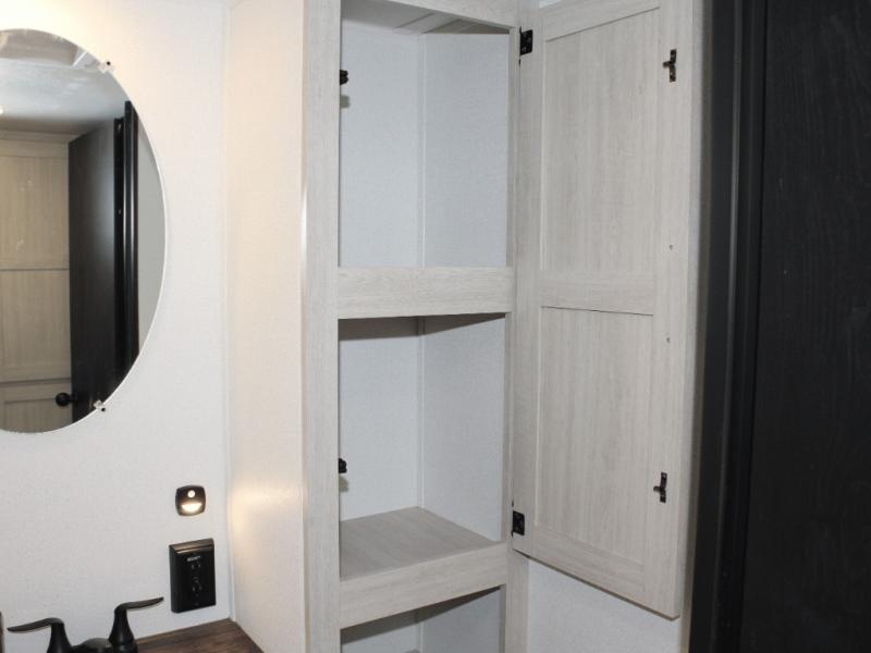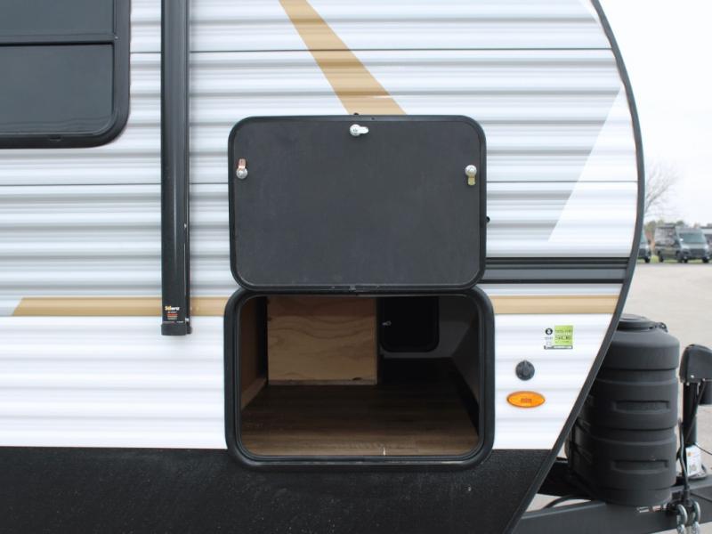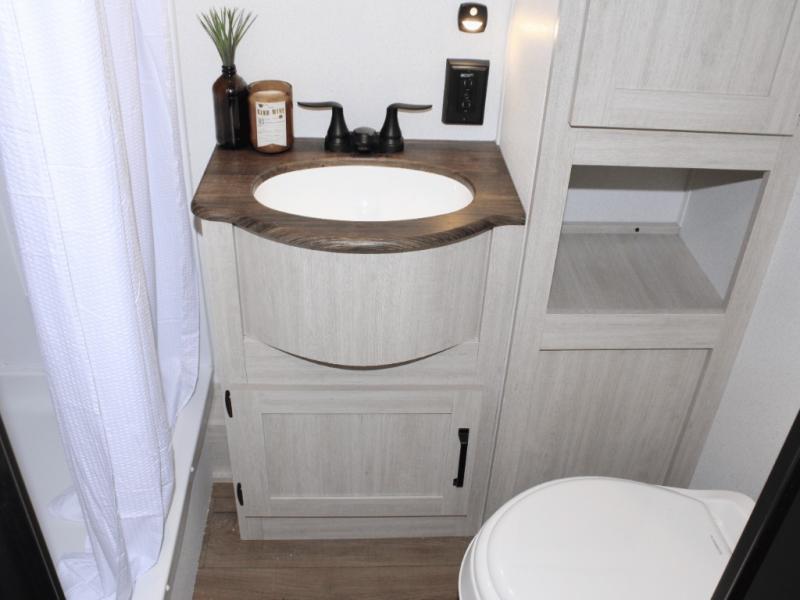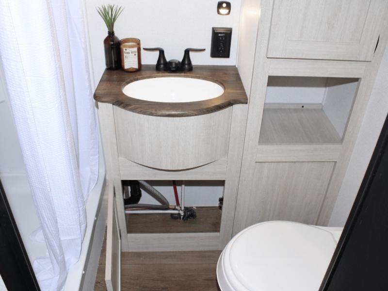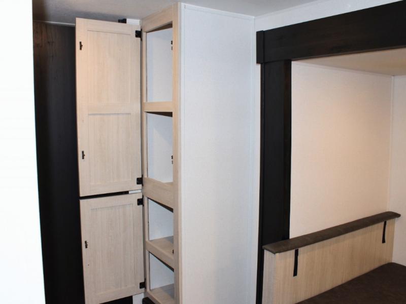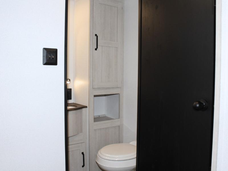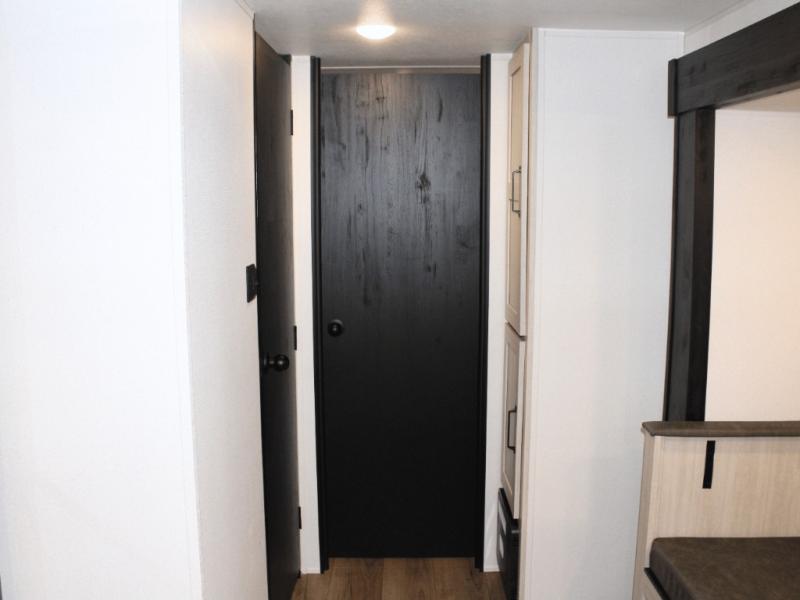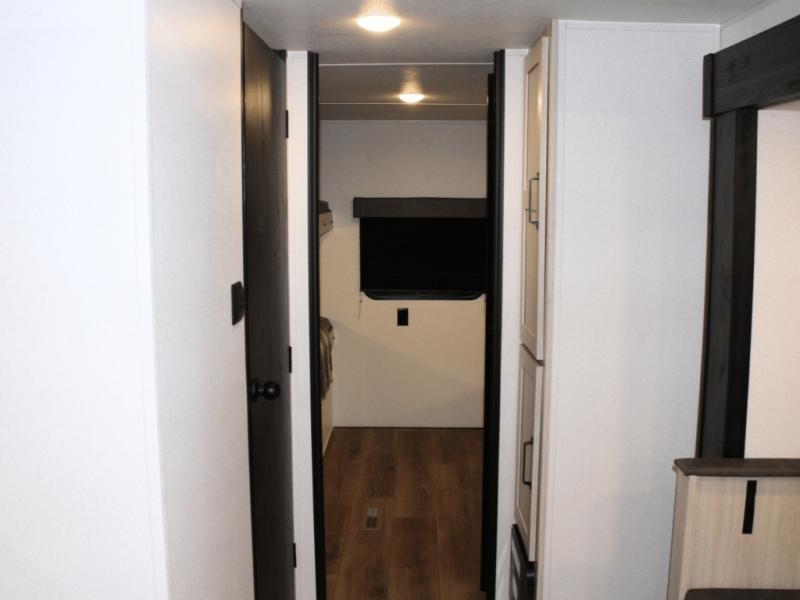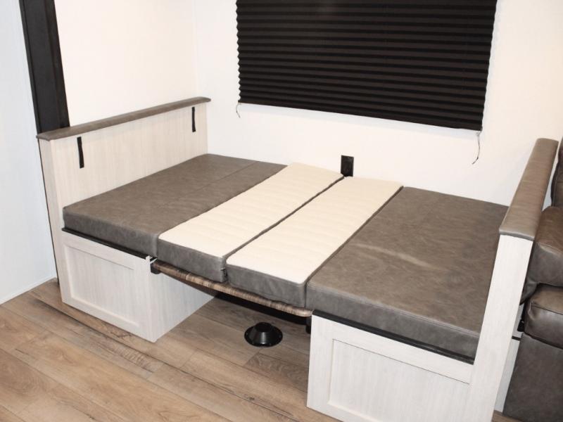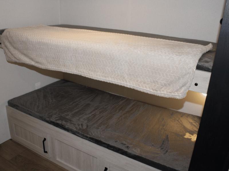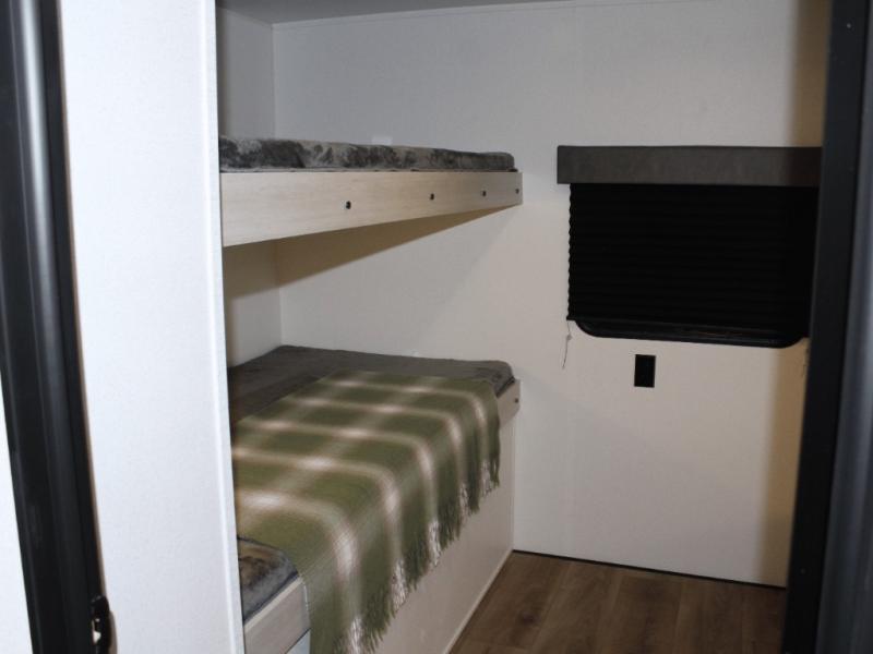 Families and guests will love the rear private bunkhouse, featuring 38" x 76" bunks across from a third bunk and jiffy sofa inside a slide-out, providing a comfortable and private space for everyone. The front master bedroom offers a cozy retreat with privacy and storage, making it easy to rest and recharge for the next day of adventure.