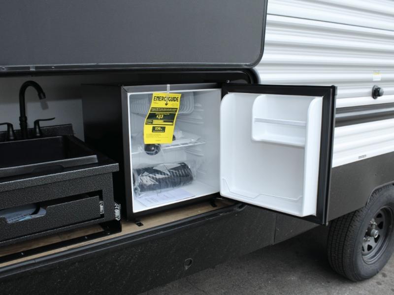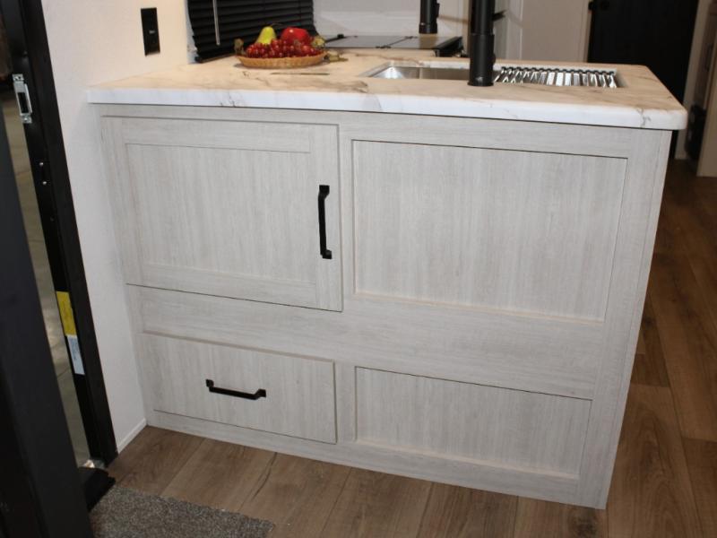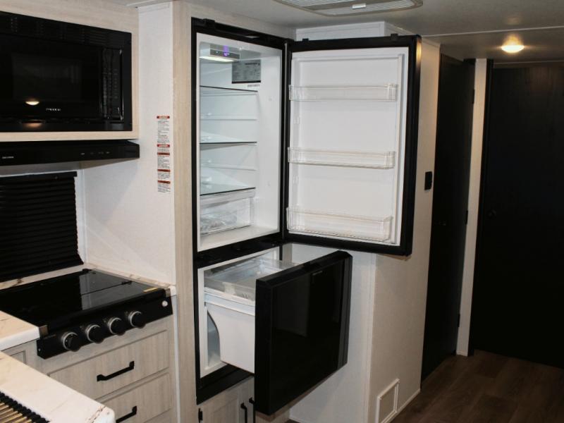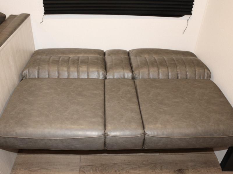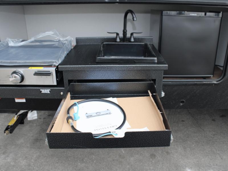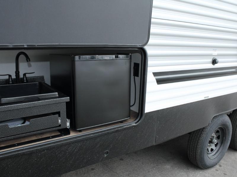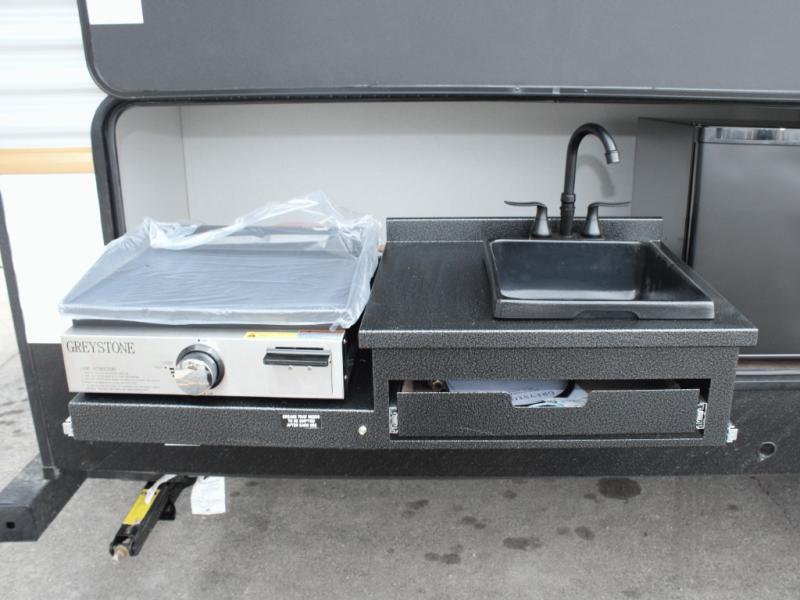 Step into the large slide-out living area, where the booth dinette and sofa sit across from the optional TV, creating the perfect spot for meals, games, or movie nights. The full kitchen comes equipped with a three-burner cooktop, microwave, 12V refrigerator, and pantry, giving you everything you need to prepare home-cooked meals on the go. For those who love outdoor cooking, the optional mini kitchen with a grill adds extra versatility for fun meals under the stars.