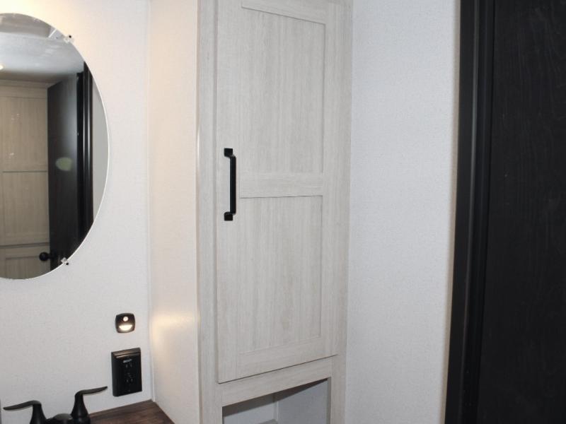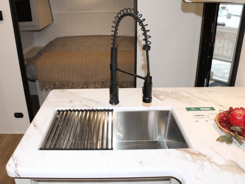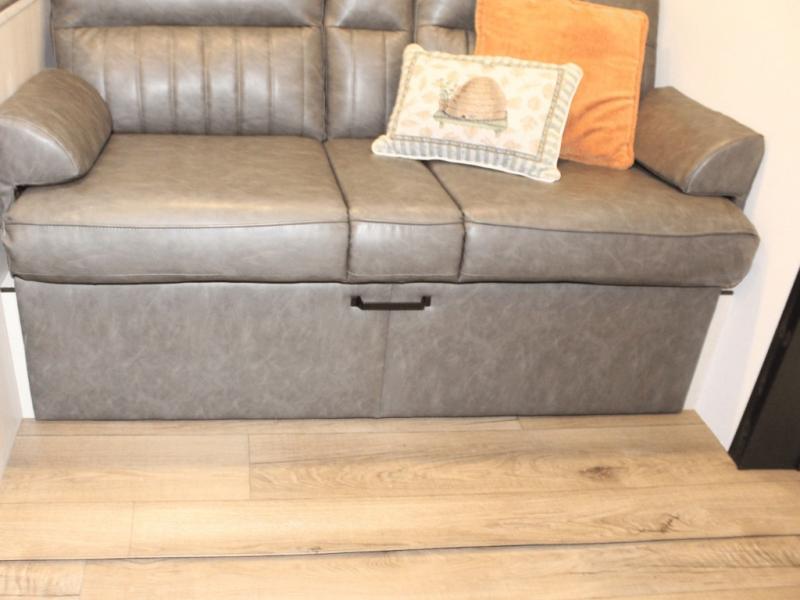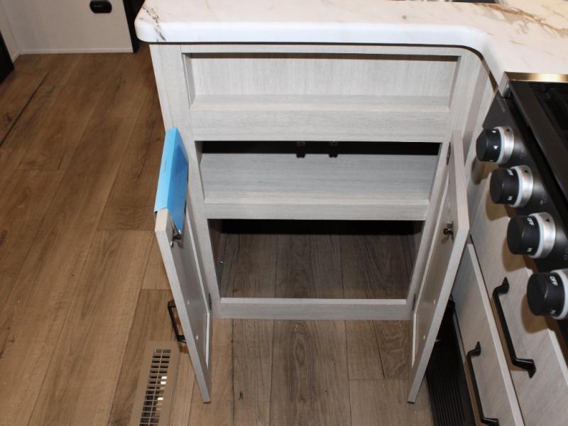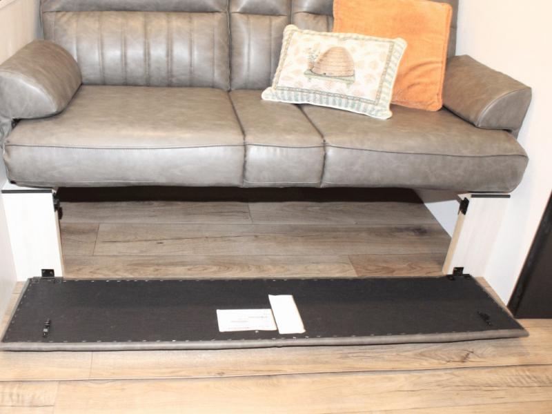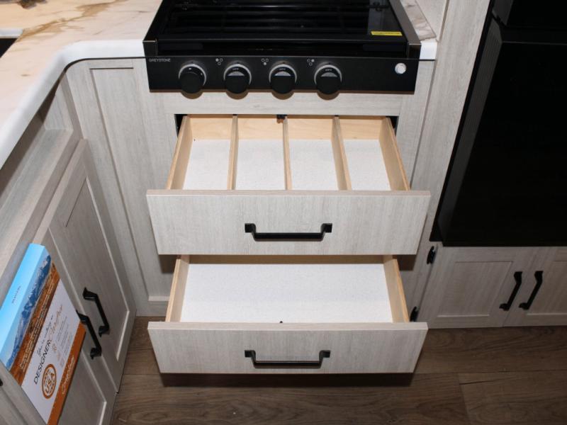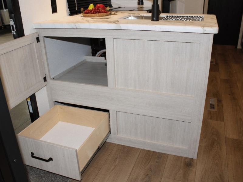Step into the large slide-out living area, where the booth dinette and sofa sit across from the optional TV, creating the perfect spot for meals, games, or movie nights. The full kitchen comes equipped with a three-burner cooktop, microwave, 12V refrigerator, and pantry, giving you everything you need to prepare home-cooked meals on the go. For those who love outdoor cooking, the optional mini kitchen with a grill adds extra versatility for fun meals under the stars.