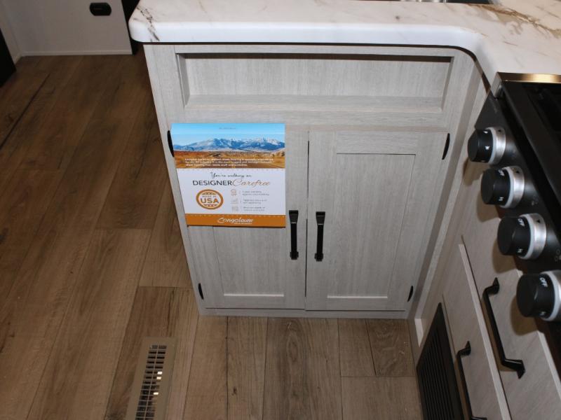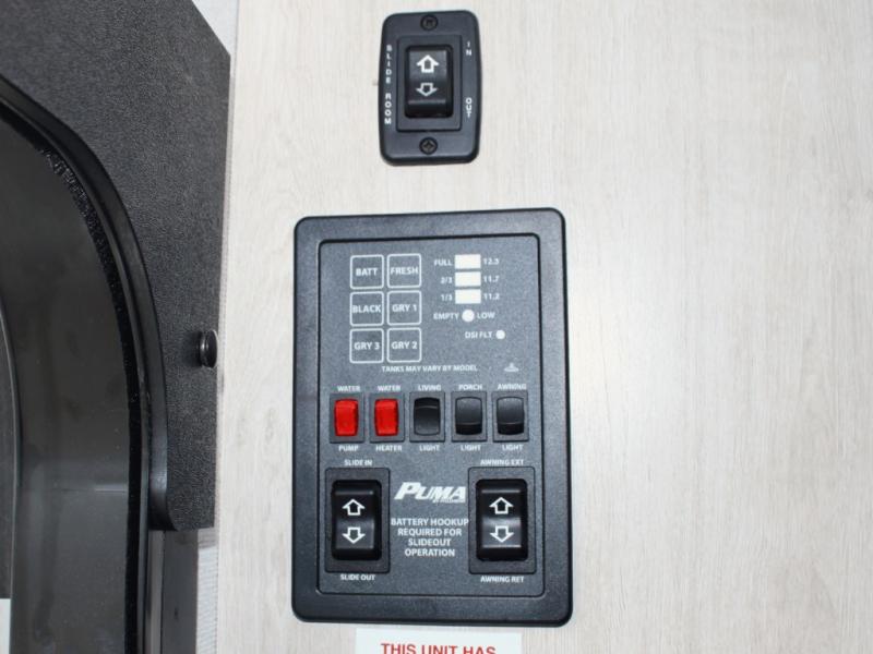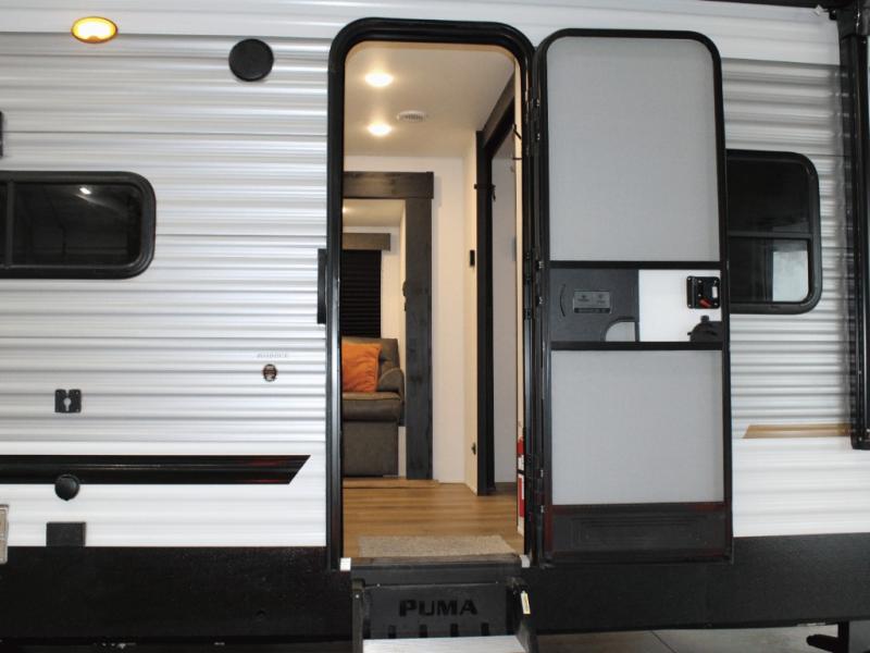The Puma Camping Edition is built for durability and convenience. Featuring 5/8" tongue and groove plywood flooring, a front diamond plate for protection, exterior magnetic baggage door latches, backup camera prep, and a battery disconnect, it’s made to handle years of family adventures. Inside, Thermofoil countertops with smooth drop edges, bedroom USB ports, outlets, and pleated shades in the living area provide modern comforts that make every trip feel like home.