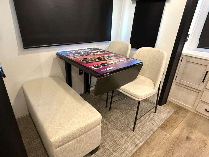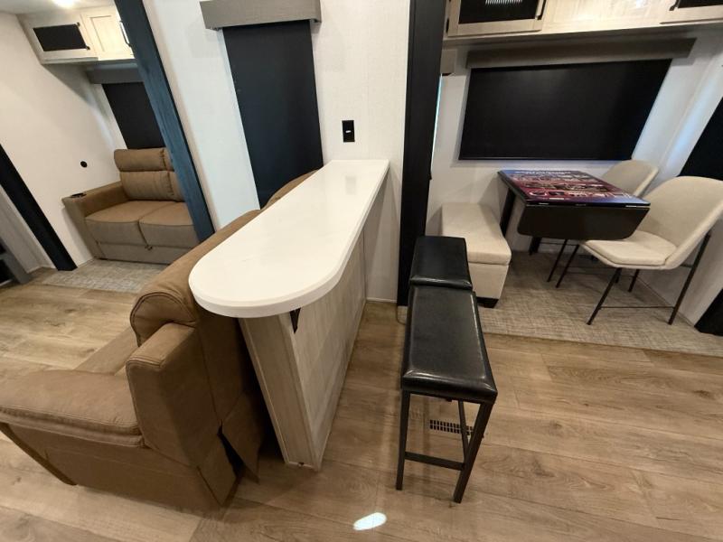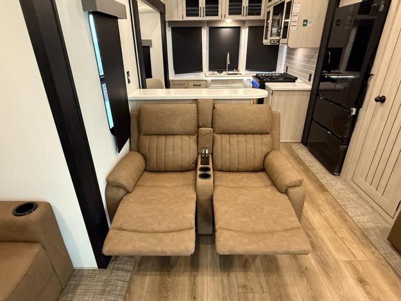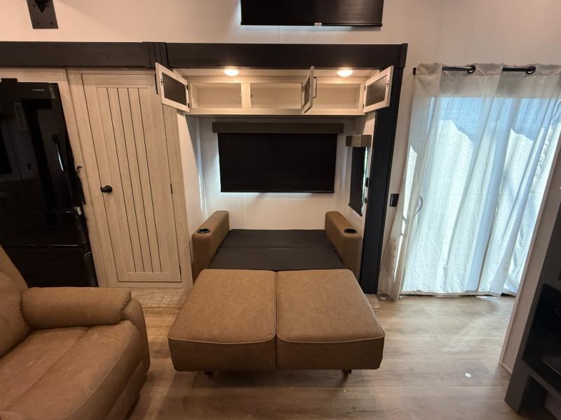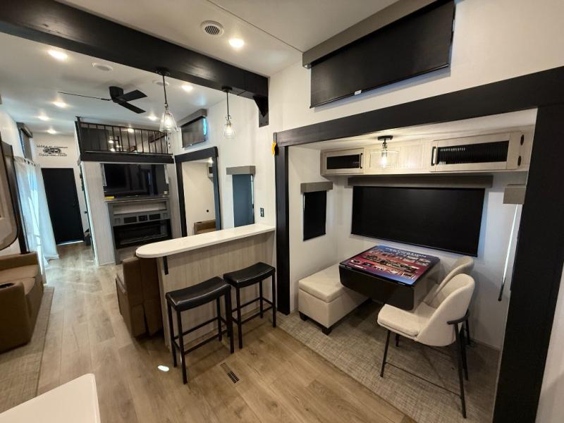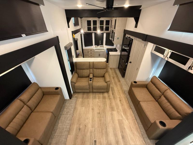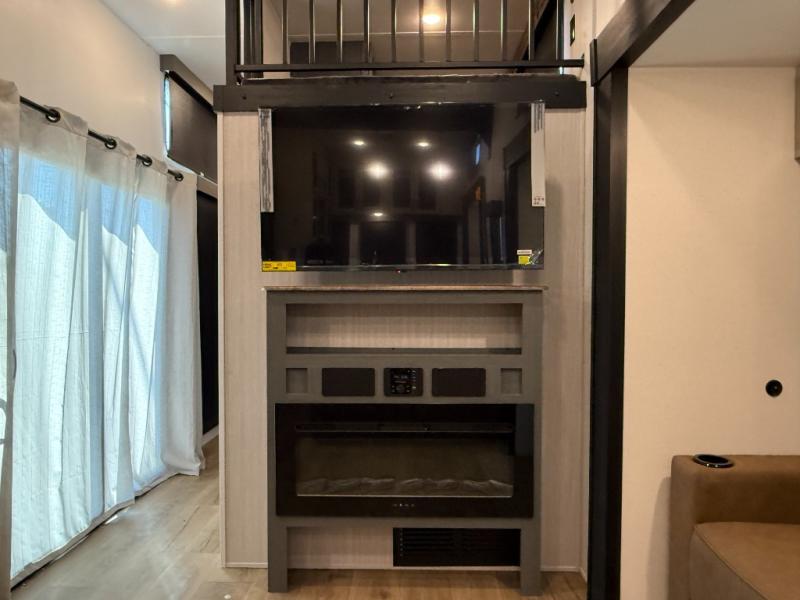 Living Room: Mid-coach living; room for sofas / recliners, theater seating (depending on options), and an entertainment center with a 50? TV and electric fireplace (color-changing) in many builds.
