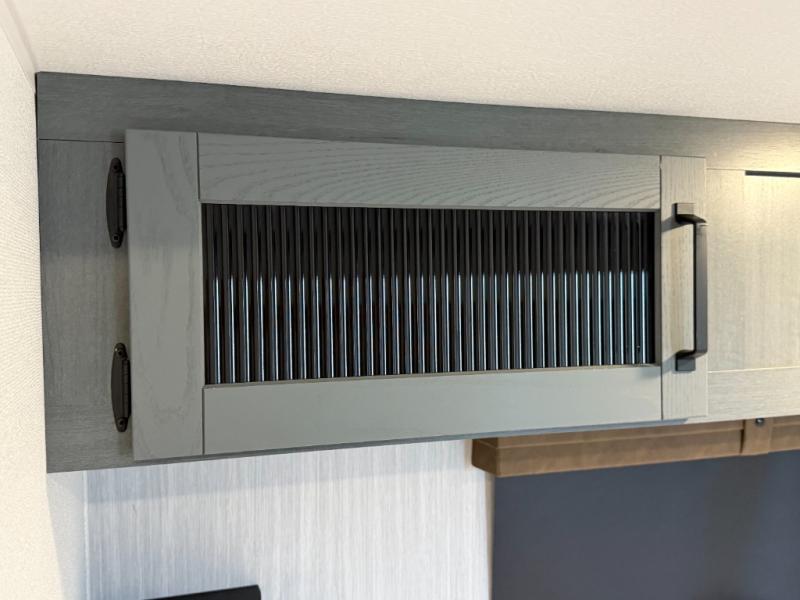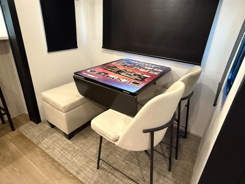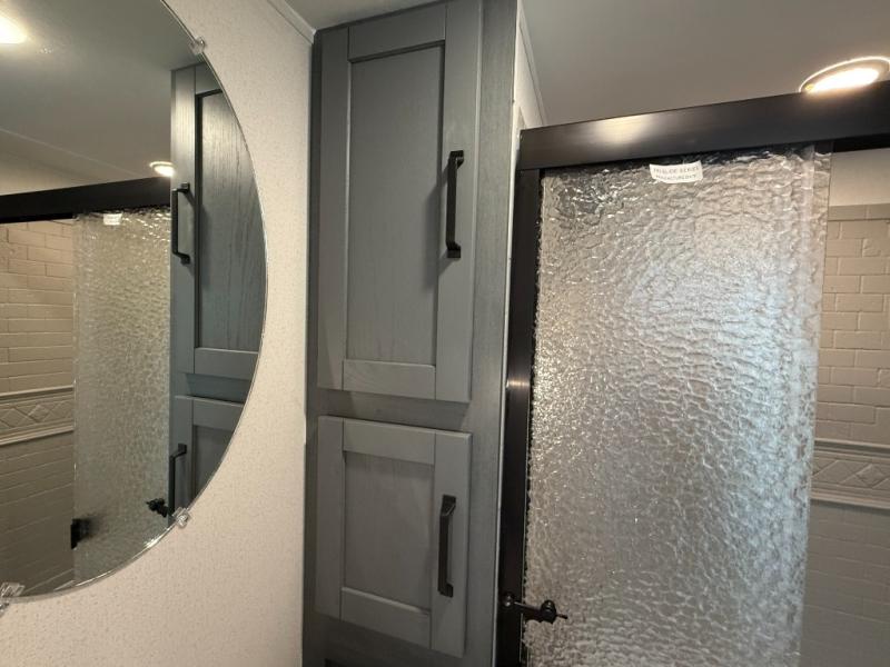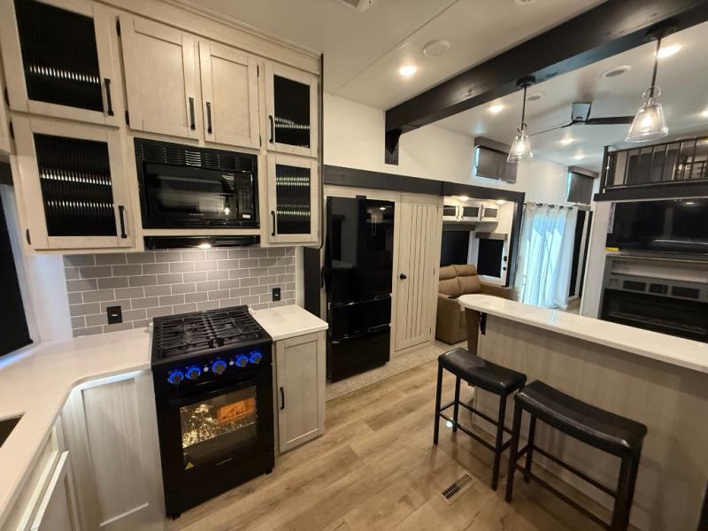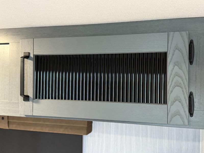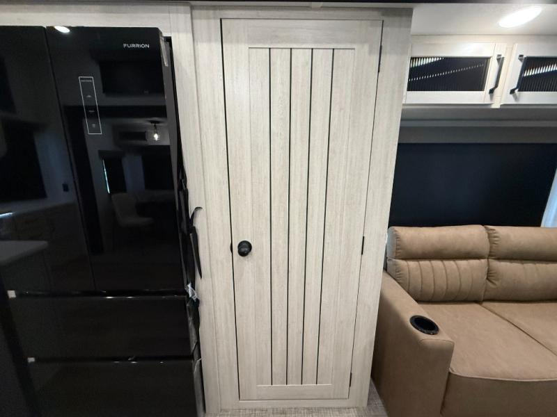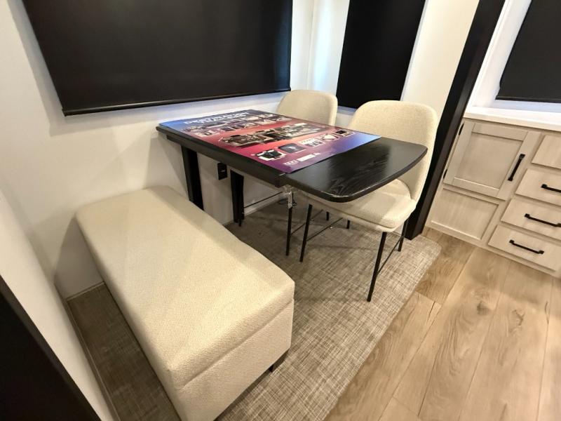 Living Room: Mid-coach living; room for sofas / recliners, theater seating (depending on options), and an entertainment center with a 50? TV and electric fireplace (color-changing) in many builds.