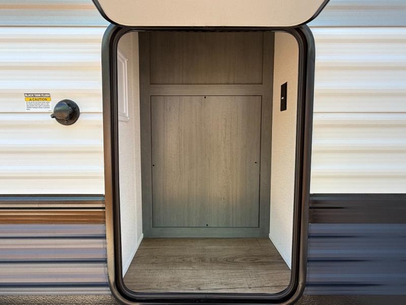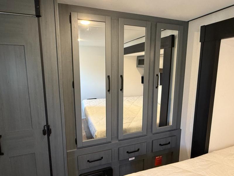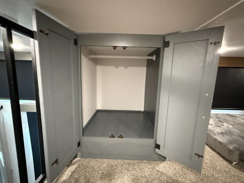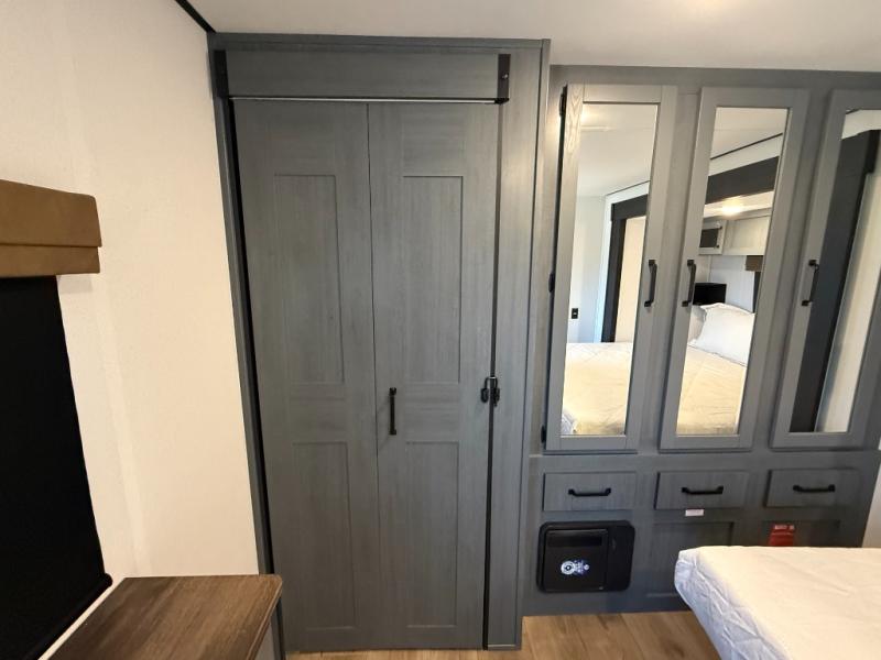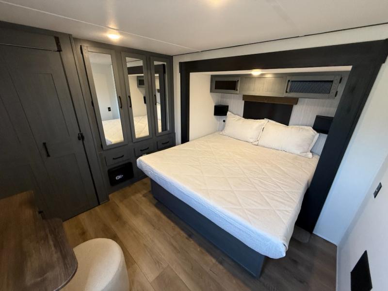 Rear Bedroom: King bed slide-out + large wardrobe + space for washer/dryer prep.
