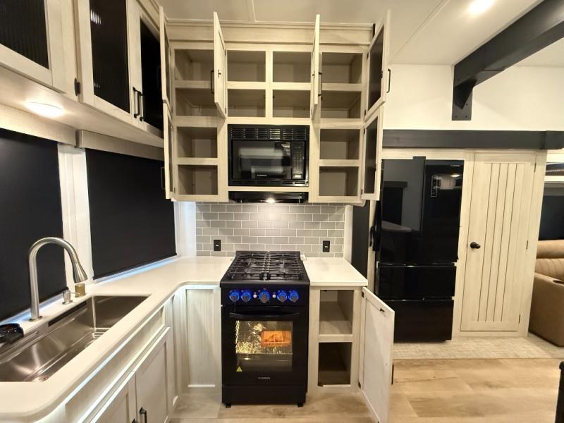 Kitchen: Front kitchen layout. Includes a residential refrigerator, a 24? stainless steel oven with 4-burner cooktop, a microwave, a pantry, and solid surface counters (with certain packages).