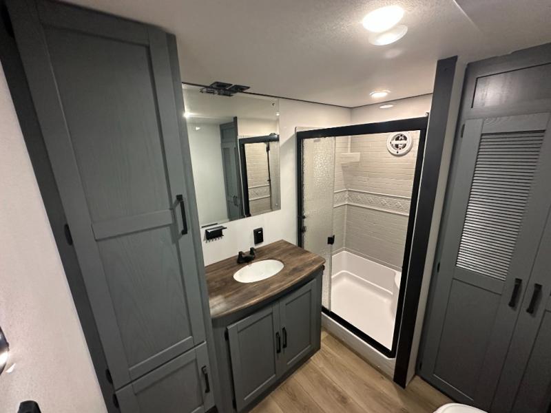 Full rear bathroom featuring a 32?×40? shower with seat, vanity, medicine cabinet, etc.