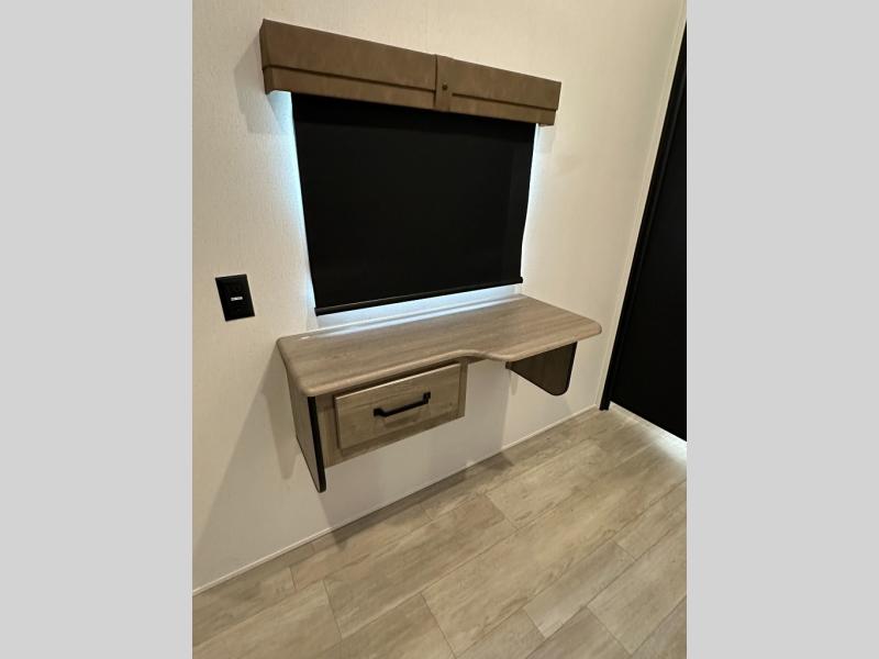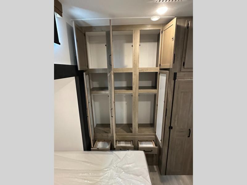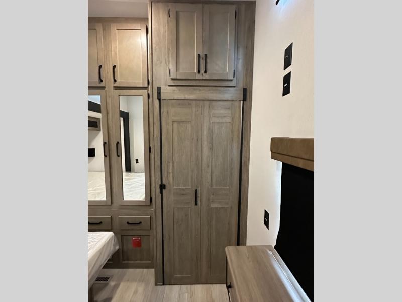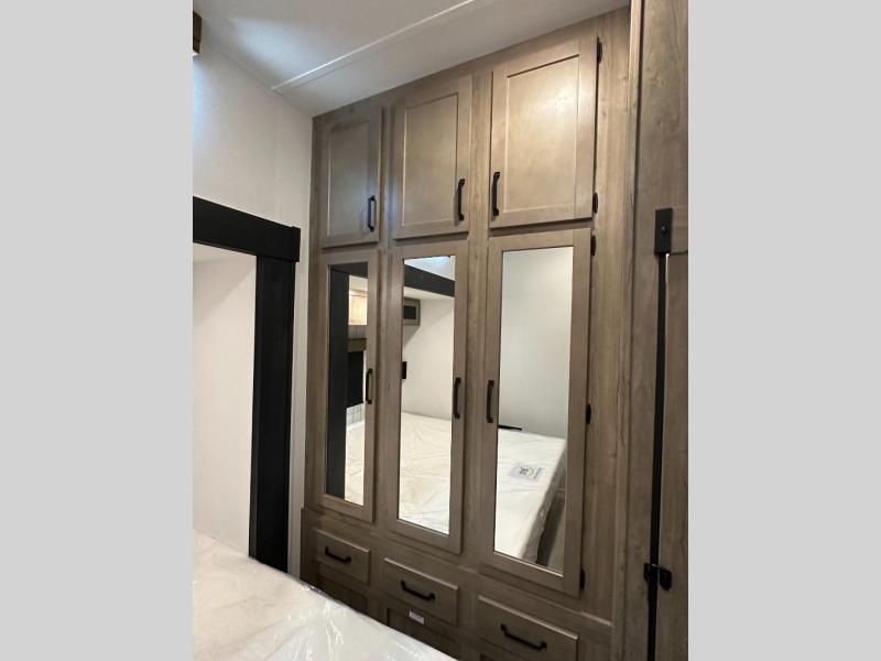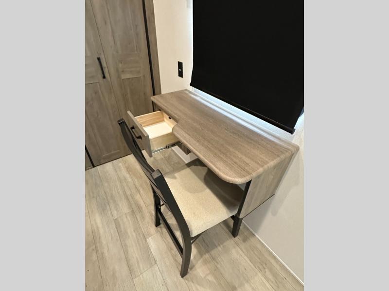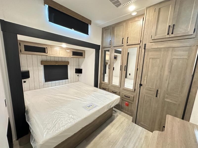 Front master bedroom: King bed slide out, wardrobe/closet, optional bedroom desk, and laundry prep