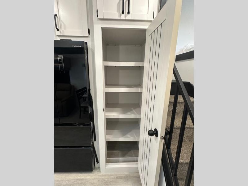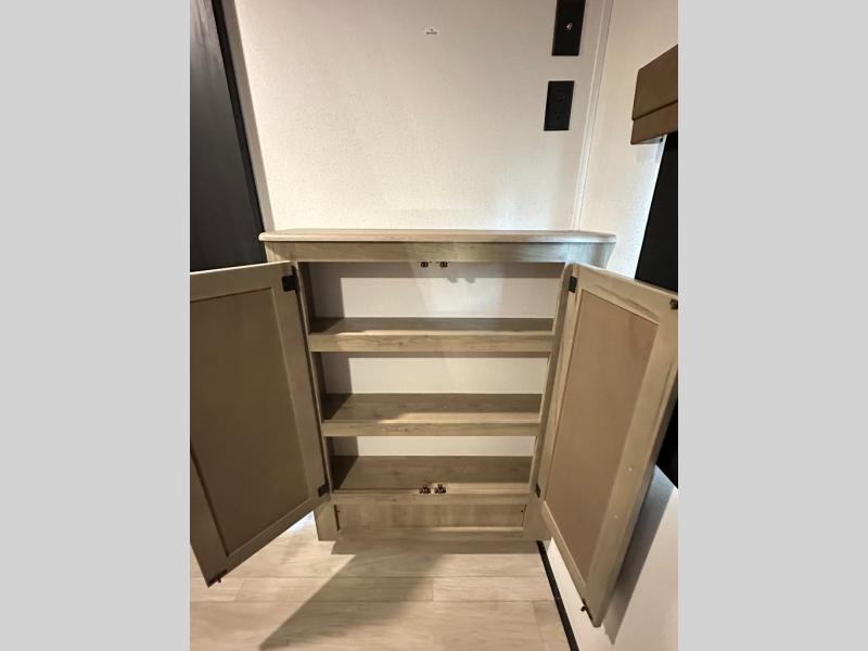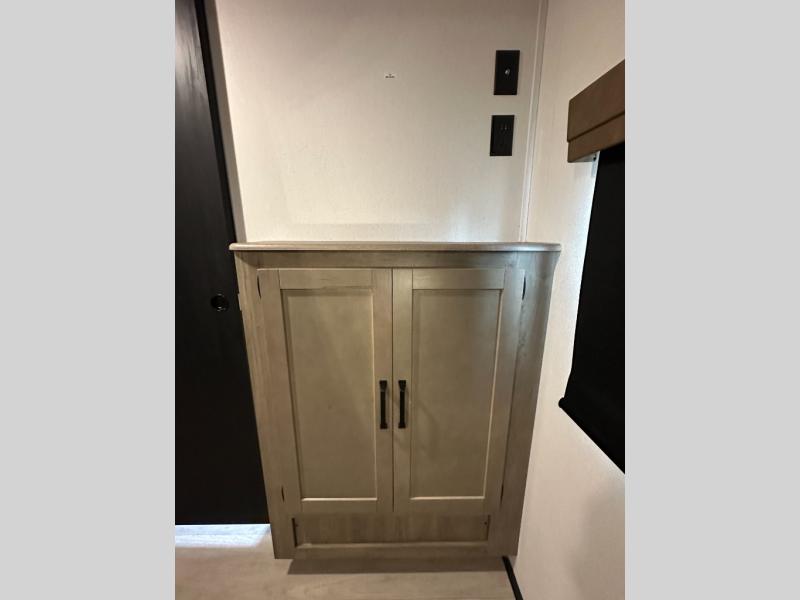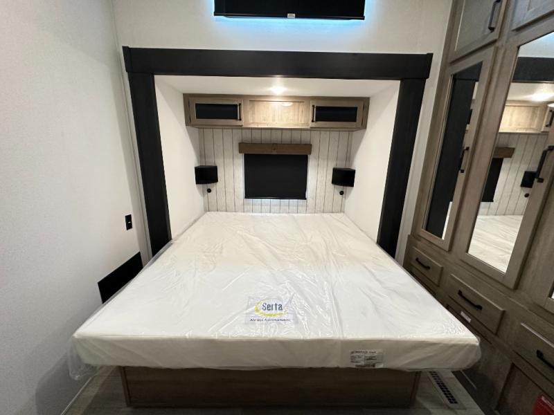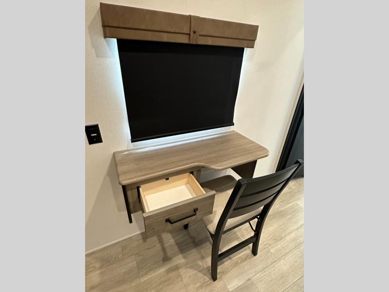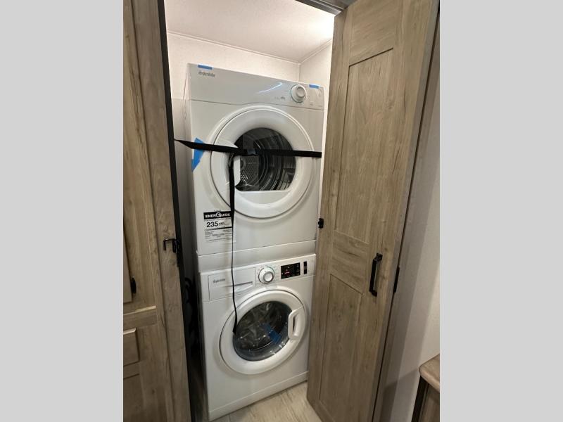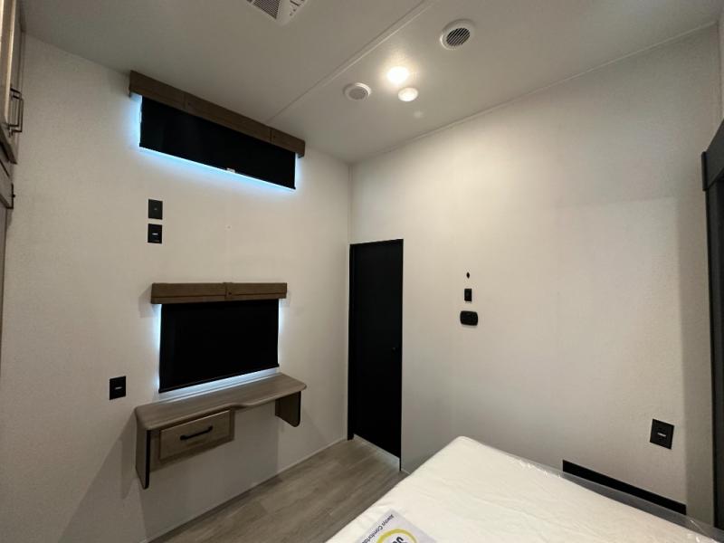 Front master bedroom: King bed slide out, wardrobe/closet, optional bedroom desk, and laundry prep