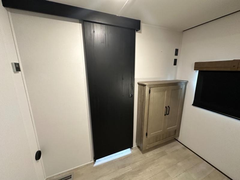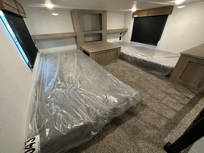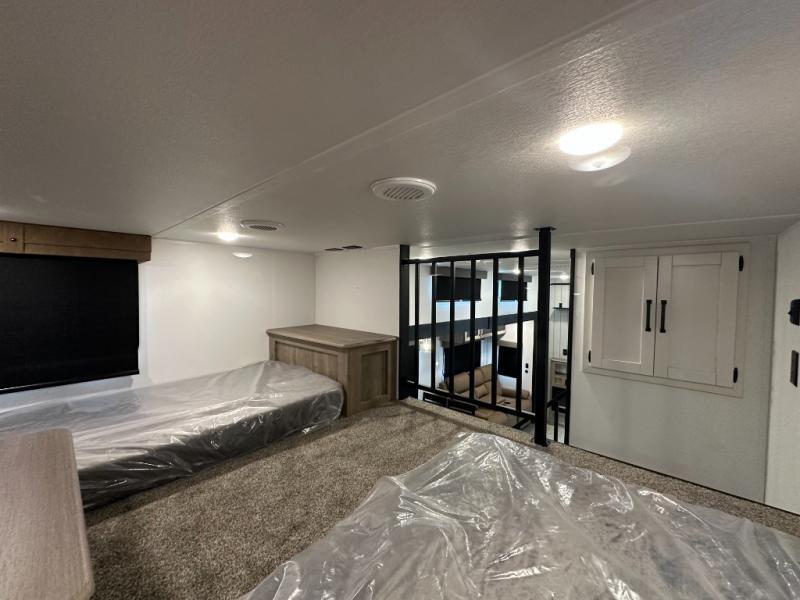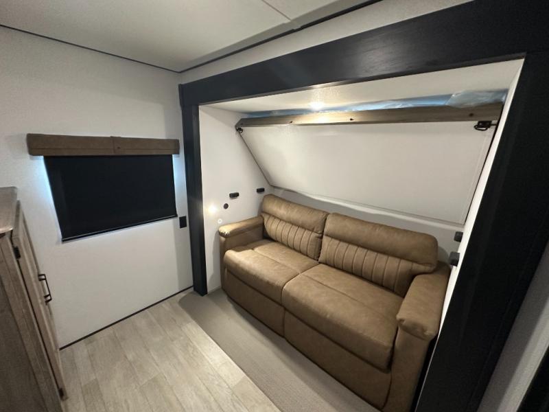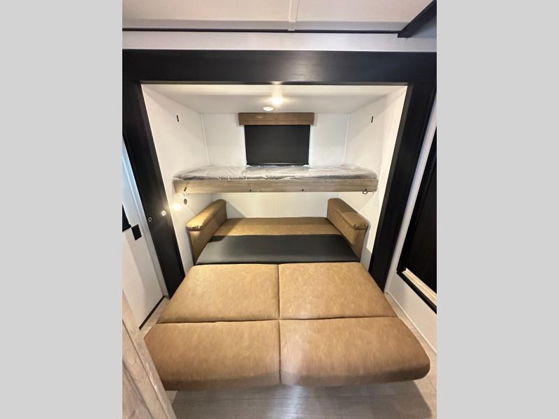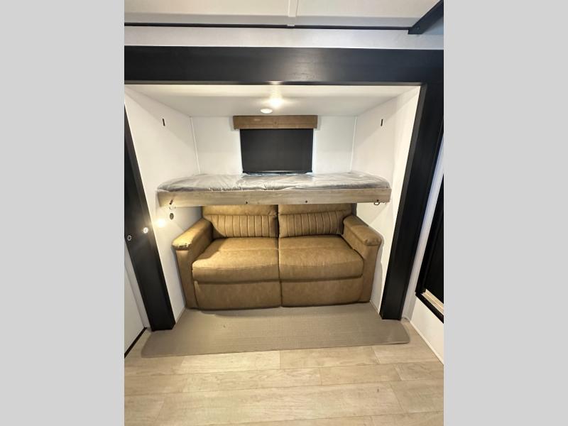 Rear bunkhouse suite: Includes bunk bed with slide-out sofa, full bath, entertainment center, and a dedicated entry door.