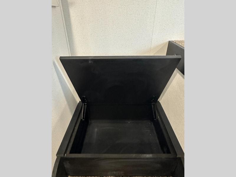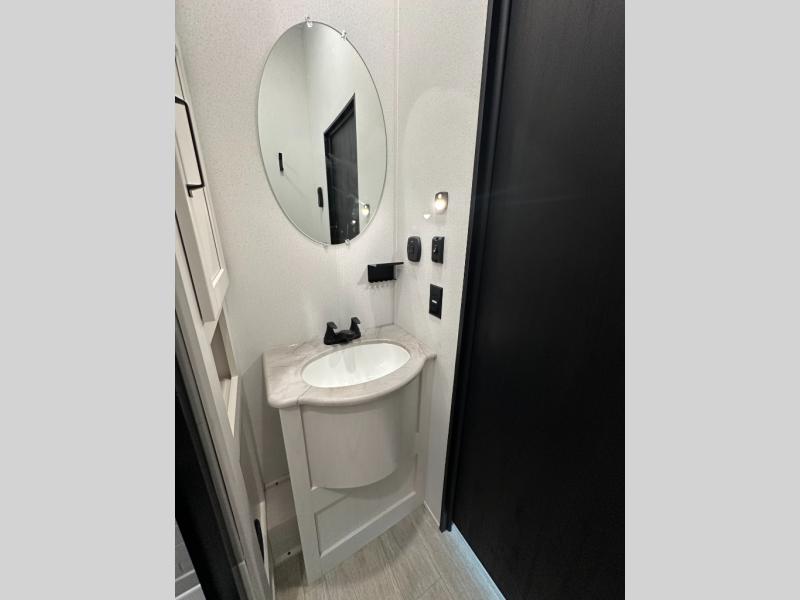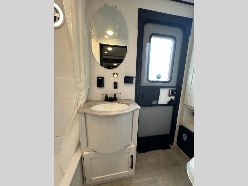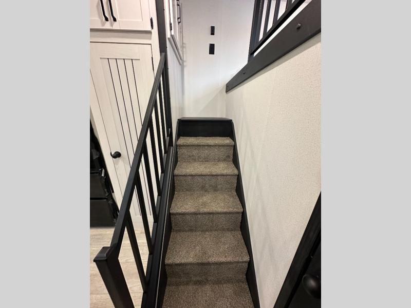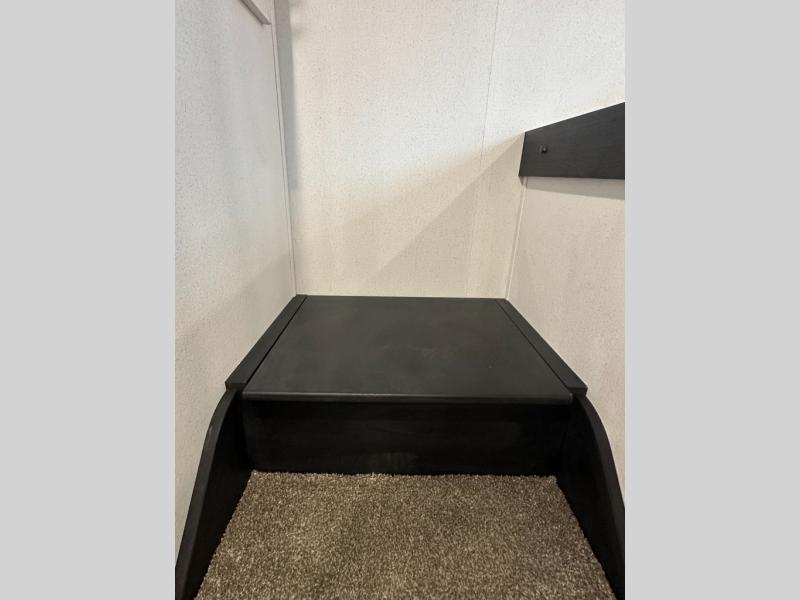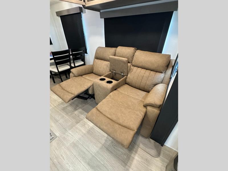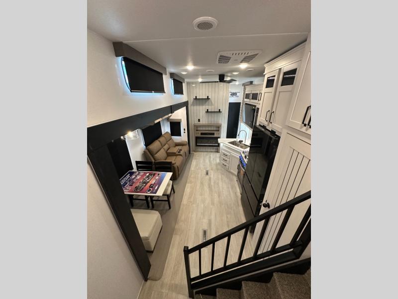 Rear bunkhouse suite: Includes bunk bed with slide-out sofa, full bath, entertainment center, and a dedicated entry door.