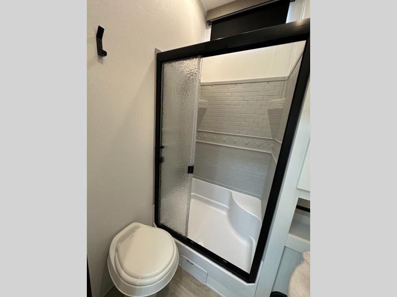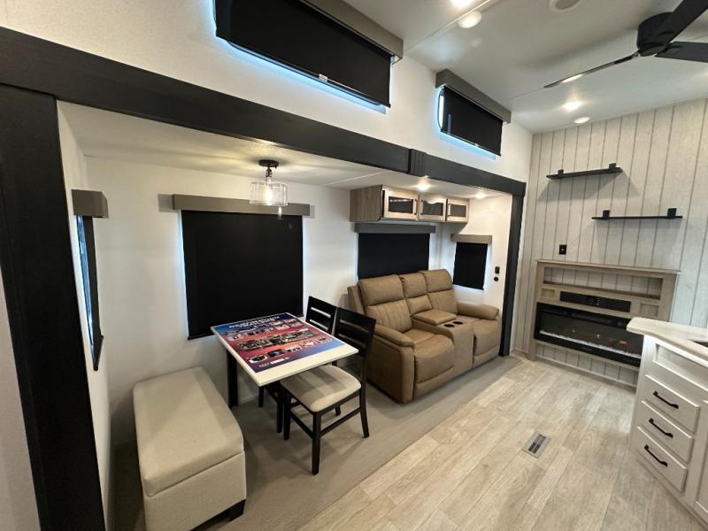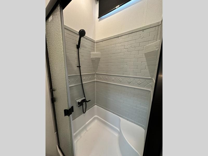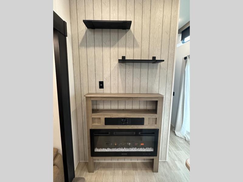 Additional amenities from the Marquis Edition package: ceiling fans, exterior speakers, 5,100 BTU color-changing fireplace, patio door, solid surface countertops, outside shower, and 50amp service