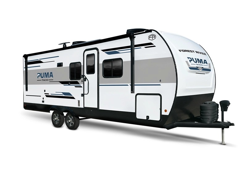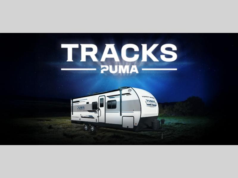Each Puma Tracks travel trailer by Forest River is constructed with a fully enclosed/heated underbelly for added protection against the elements, plus a fully laminated roof and rear wall for durability. The slam latch baggage doors with magnets will make it easier than ever to pack up your camp gear, and the power awning with LED lights will provide shade during the day and inviting ambiance at night. Head inside to enjoy the roller shades, smoked glass kitchen cabinet doors, stainless-steel sink, and LED lights to keep your space well lit. Some of the available options include a bedroom A/C, a Wi-Fi booster, heated holding tanks, and more!