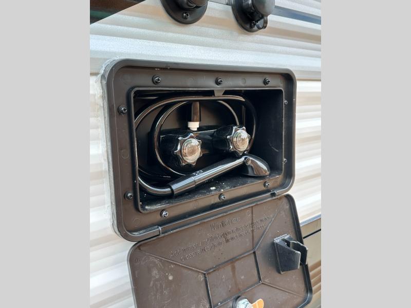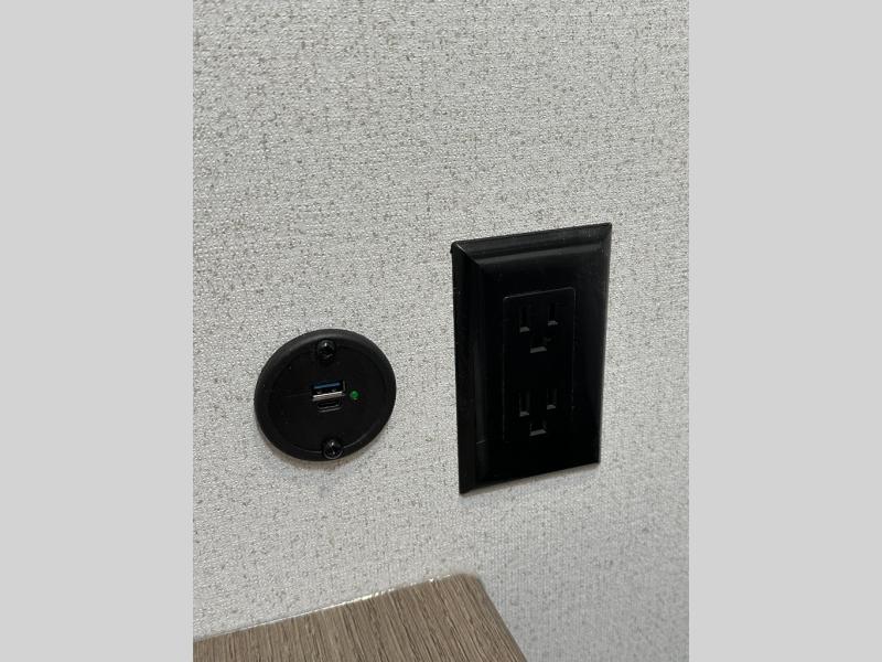 Convenience Features: USB charging ports, AM/FM/Bluetooth stereo, Wi-Fi prep (via King antenna), designer window treatments, Beauflor linoleum flooring, front diamond plate, outside shower, night roller shades, and more.