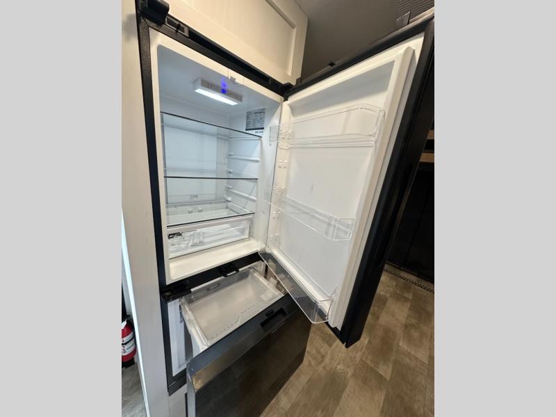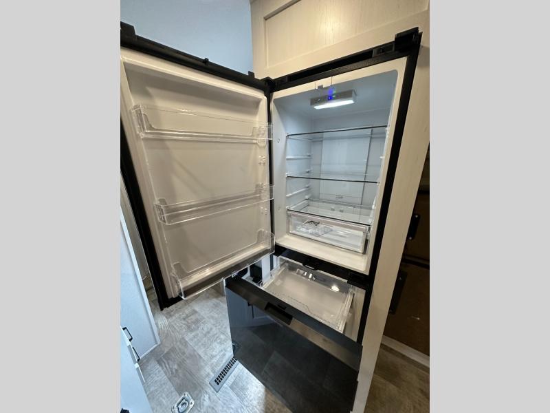 Kitchen Amenities: Equipped with a 21? stainless steel oven, 1.3 cu ft stainless microwave, and an 11 cu ft 12V stainless steel residential refrigerator.