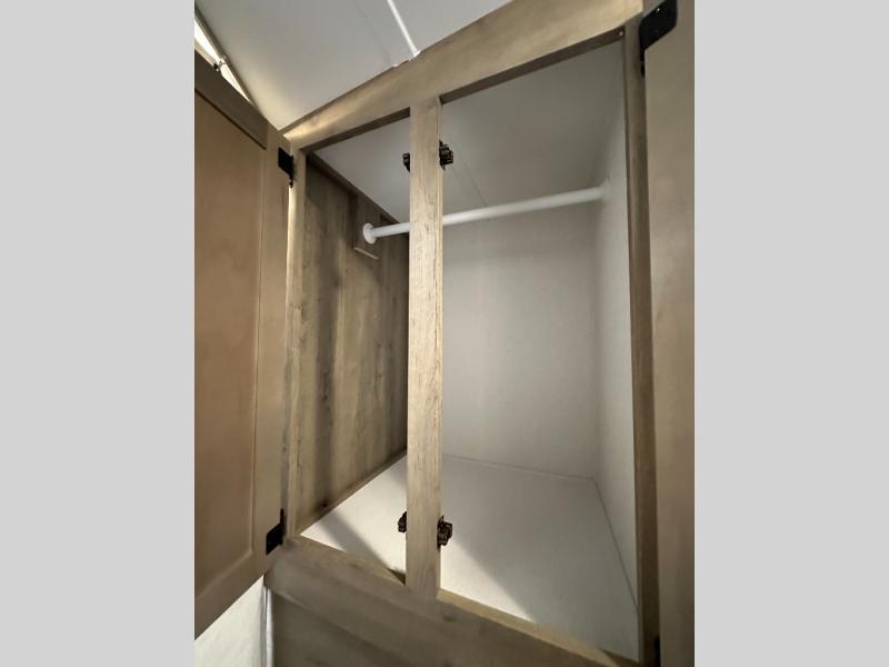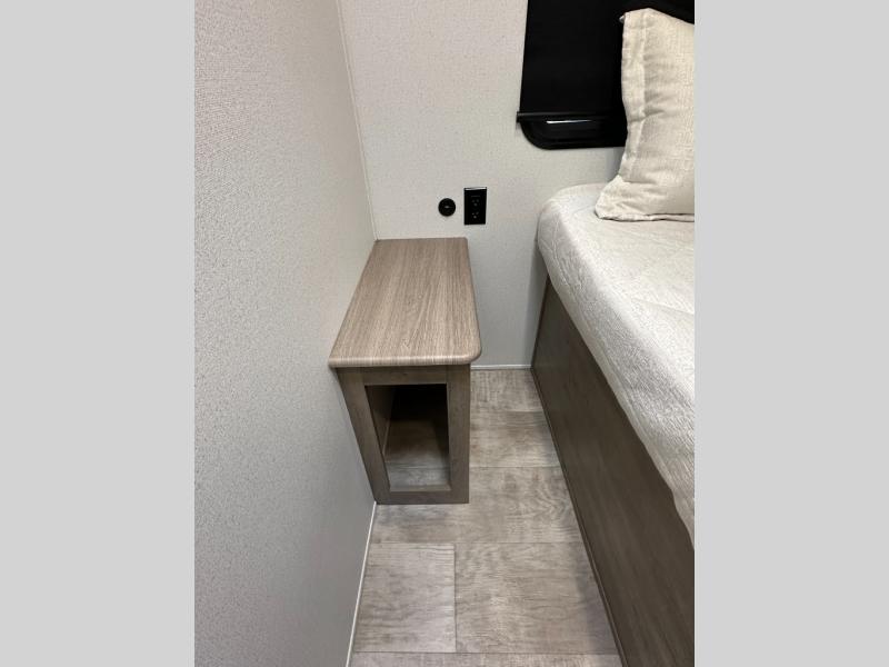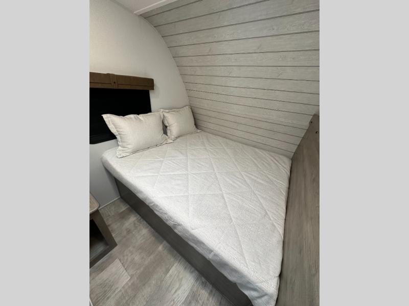 Front Bedroom: RV queen bed with wardrobe and shelf—provides a private space for rest.