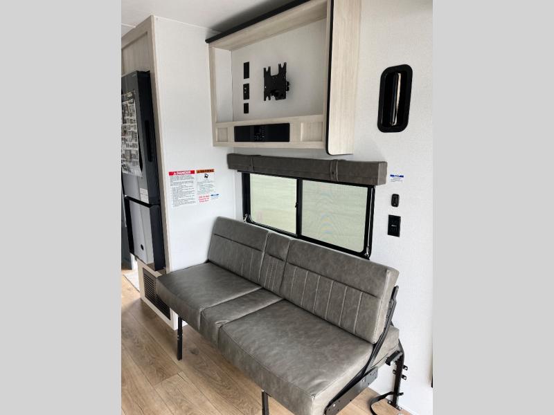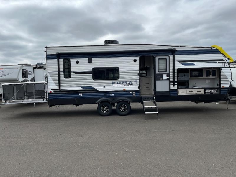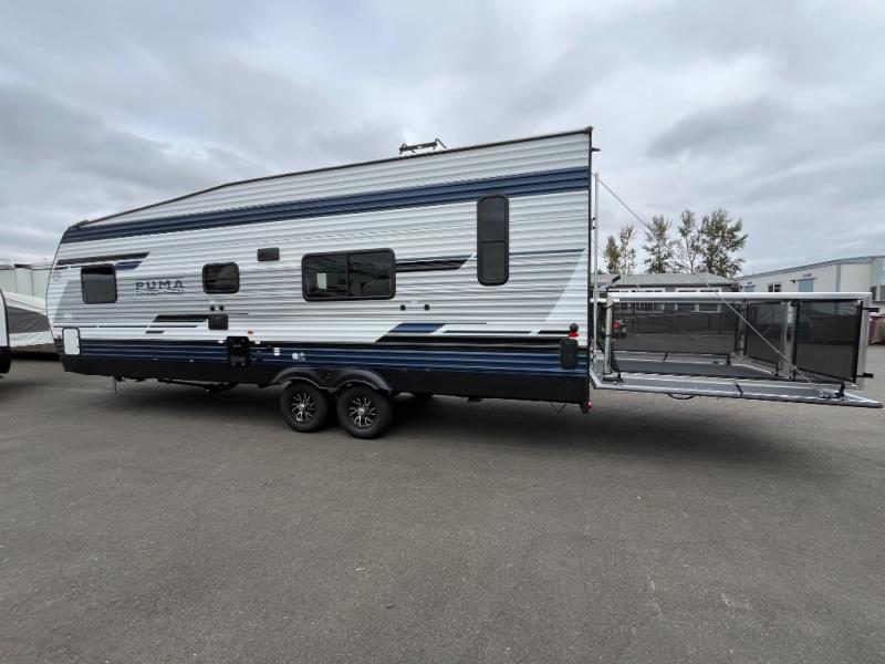 Pack your bags, grab your helmet, and load up the dirt bikes in this toy hauler for four! There is 11' of cargo space for your toys plus two flip-up sleeper sofas with a dinette for seating and sleeping space. If you have even more guests, just choose the optional queen bed electric lift. The kitchen on this Puma Unleashed includes everything you need to prepare meals each day, including a 21" stainless steel oven, a 1.3 cu. ft. stainless steel microwave, plus an 11 cu. ft. 12V refrigerator. You might even like to choose the optional outside kitchen with a griddle for breakfast outdoors! The full bath includes a private shower and toilet, with the sink right across the hall so two people can freshen up before bed, and the front bedroom is sure to bring comfort with its RV queen bed, wardrobe, and bedroom shelf for your things!