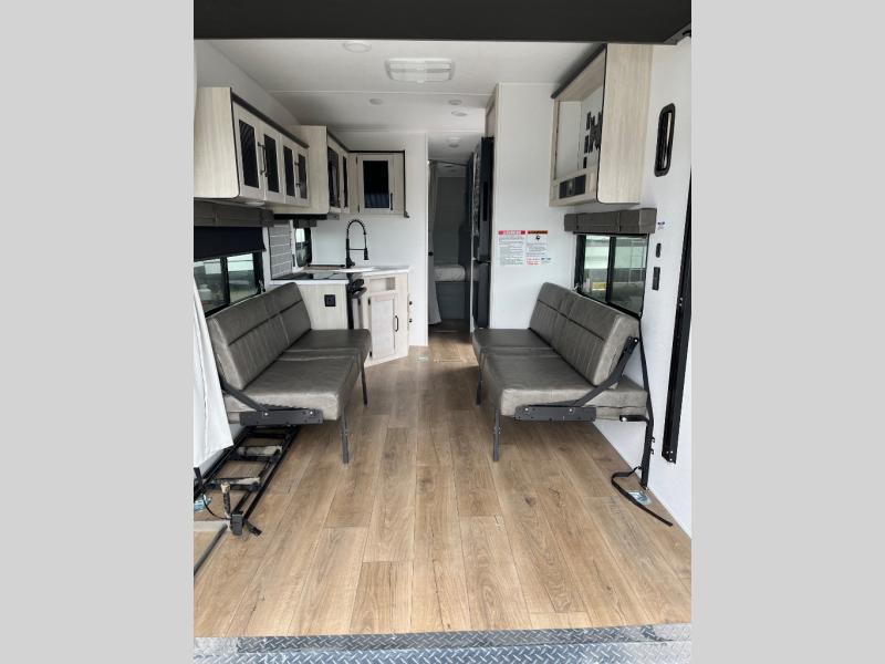 Each Puma Unleashed toy hauler travel trailer by Palomino is constructed with a durable ABS tub surround, super lube axles for smooth towing, and a rugged front diamond plate. You will enjoy premium amenities, including a plush bedspread and shams, LED lighting, and a bath skylight. Cook like a five-star chef with the 21" stainless steel oven and range hood, and indulge in entertainment with the AM/FM/Bluetooth stereo and outside speakers. Plus, you will love the convenient night roller shades, the outside shower ideal for outdoor enthusiasts, and so much more! Whether hauling motorcycles, ATVs, or gear for your next outdoor escapade, these toy hauler travel trailers are your ultimate adventure companion.