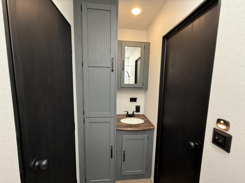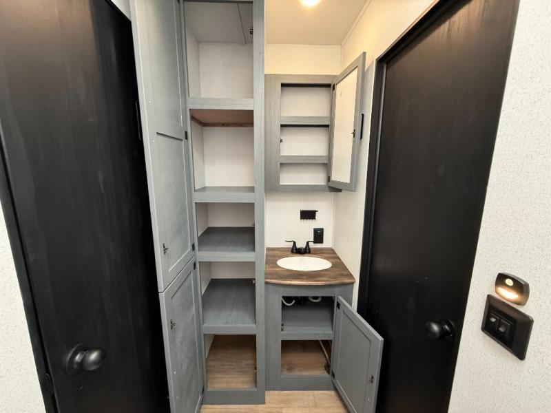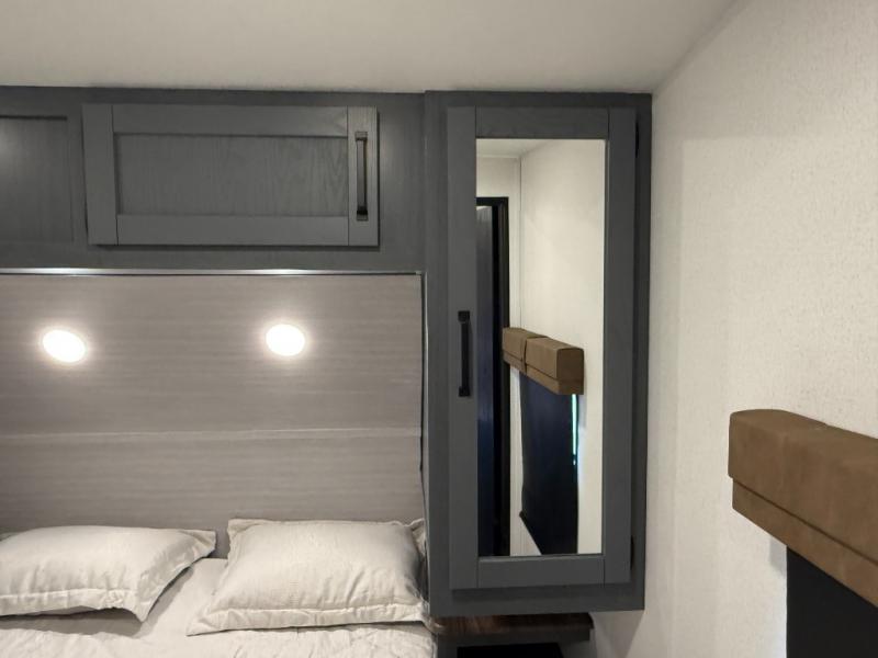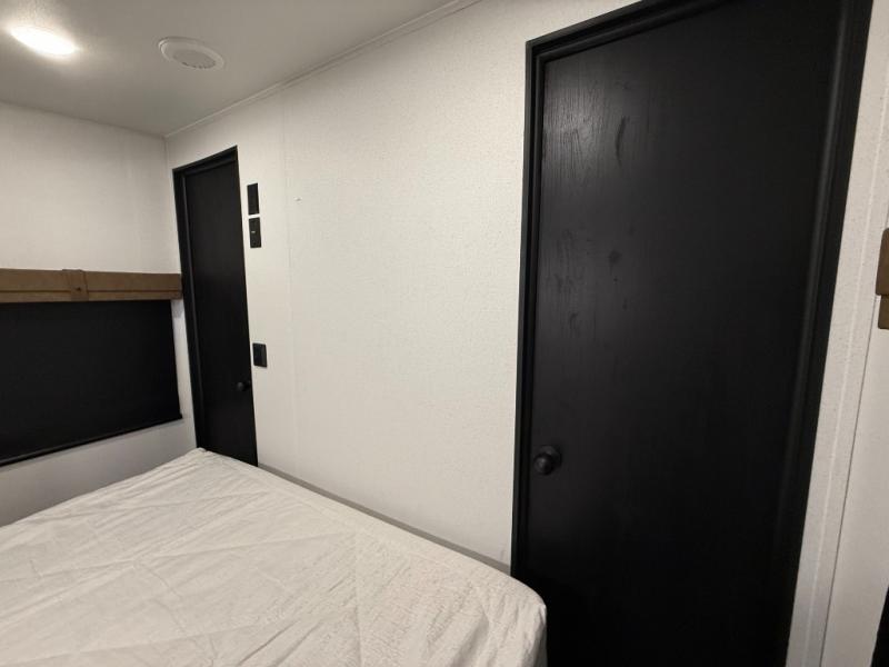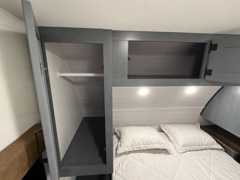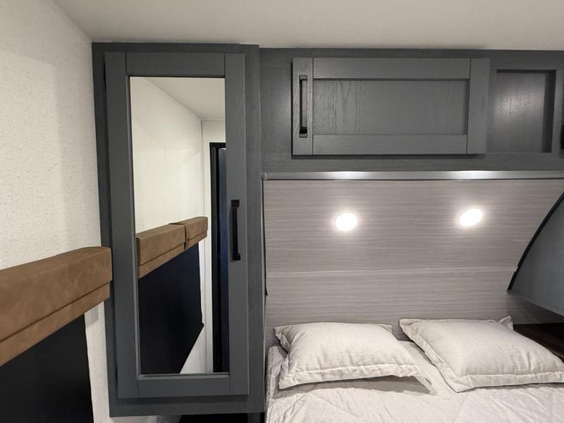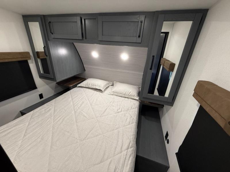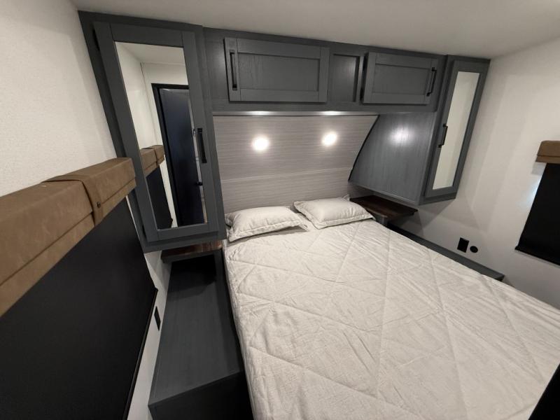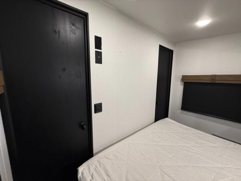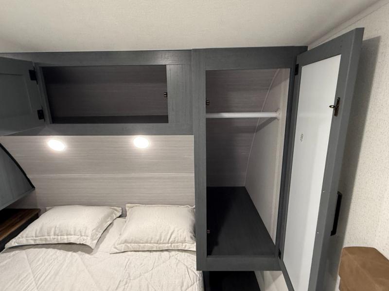 Private front bedroom with an RV queen bed, dual shirt closets.