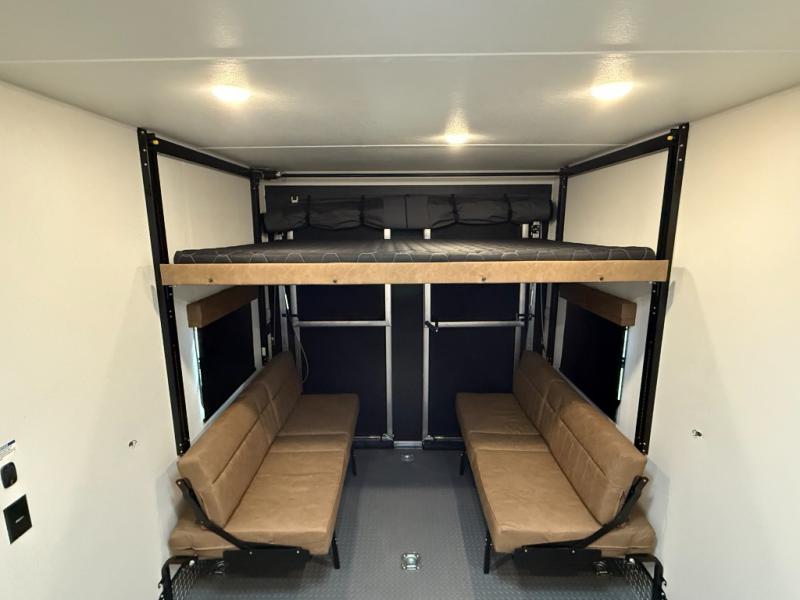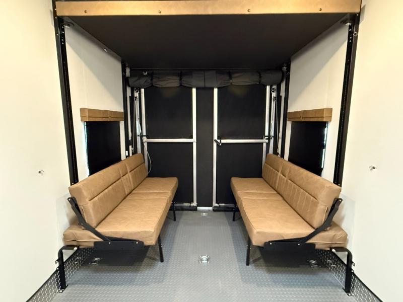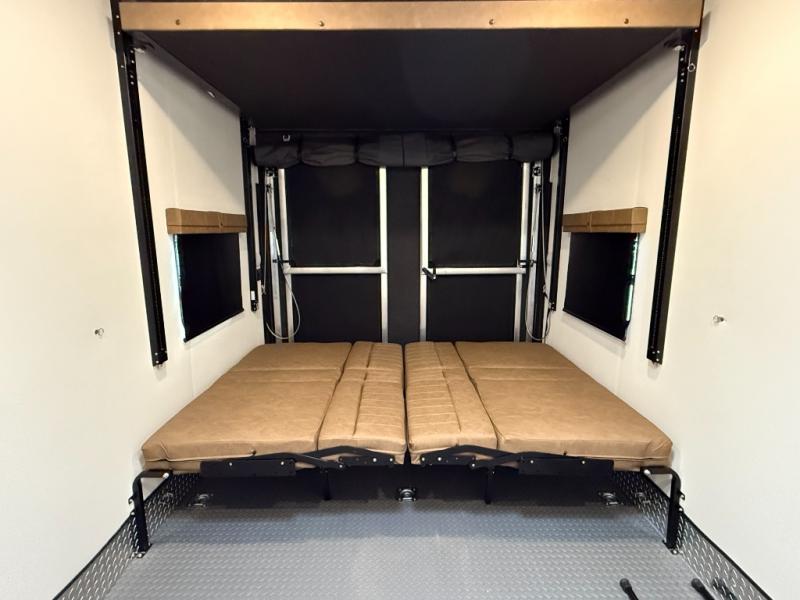 Standard 62" rollover sofas in the garage; optional queen bed electric lift for the garage space to convert it for sleeping or lounging.
