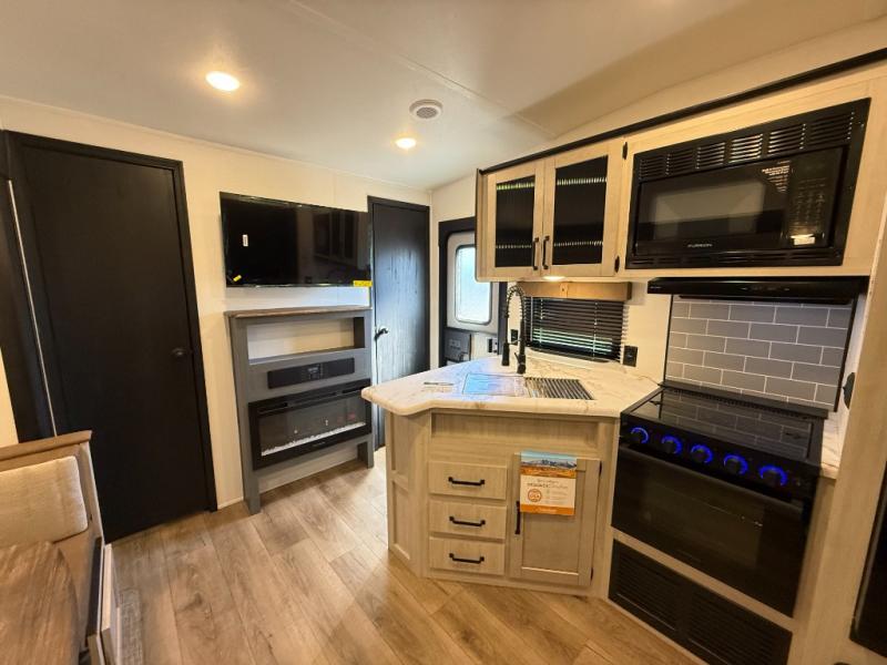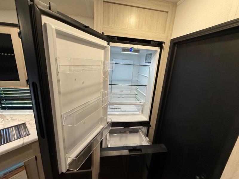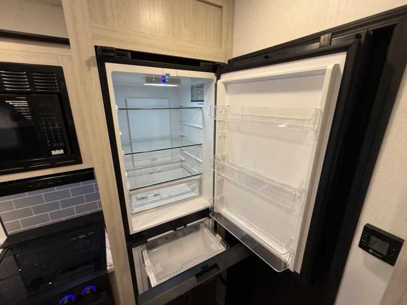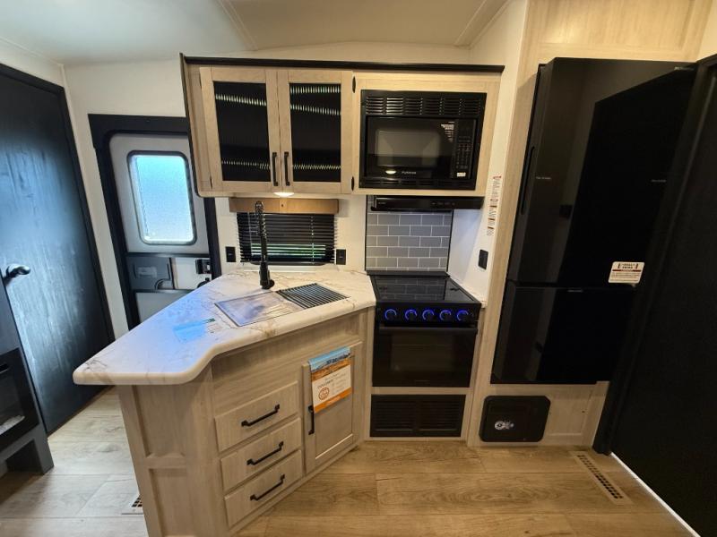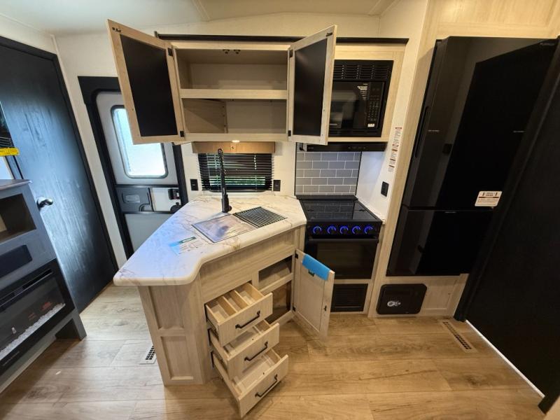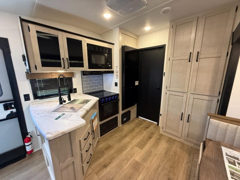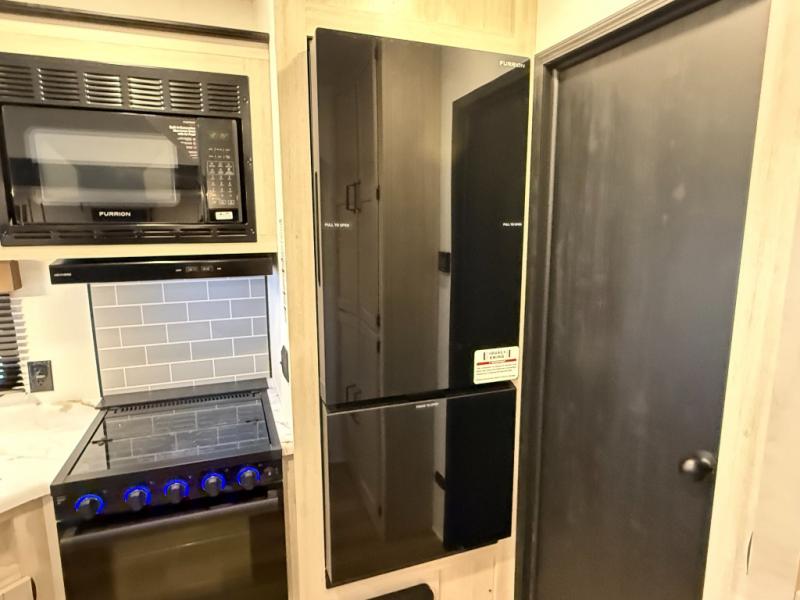 Kitchen equipped with a 21-inch stainless steel oven/range, stainless microwave, and 11 cu ft 12V residential refrigerator.