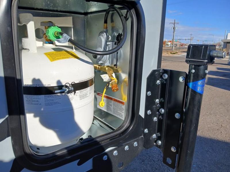 - UVW: 1,204 lb. Exterior Length: 10' 10" Exterior Height: 7' 11" Exterior Width: 76" Floor Length: 6' 5" Wheel Well: 40" Center of Gravity: 28" Fresh Water: 8 gallons. LP Tank Capacity: 20 lb.