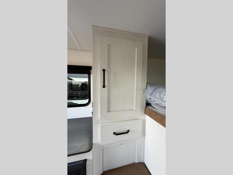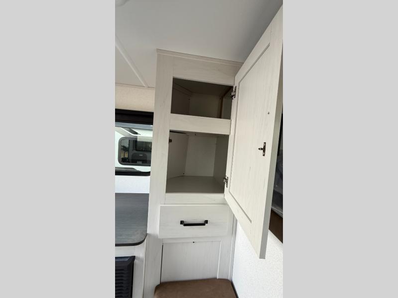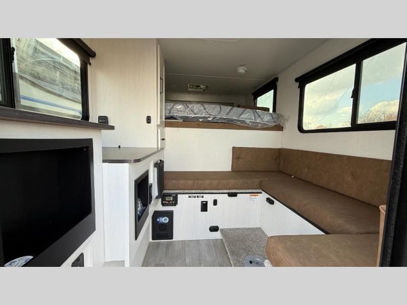 This truck camper works with a 1/2-ton truck and fits a 5' 6" or larger truck bed! Enjoy a good night's rest on the front queen bed with a 5" mattress while relaxing at the campground. The U-shaped seating with a table is great for enjoying meals and even has a storage area for a toilet. This unit also has a cooler option so you can keep perishables fresh!