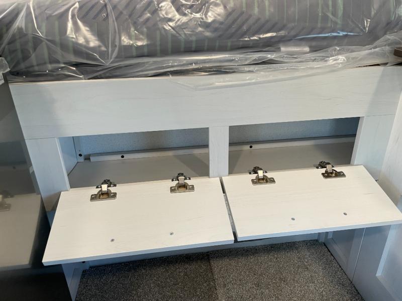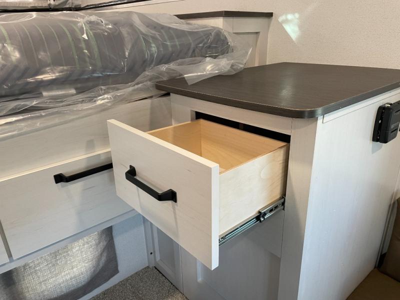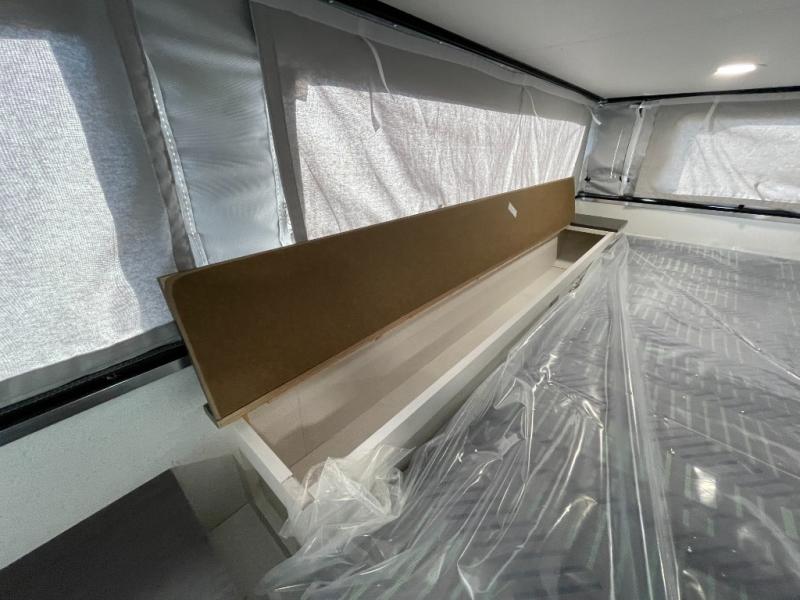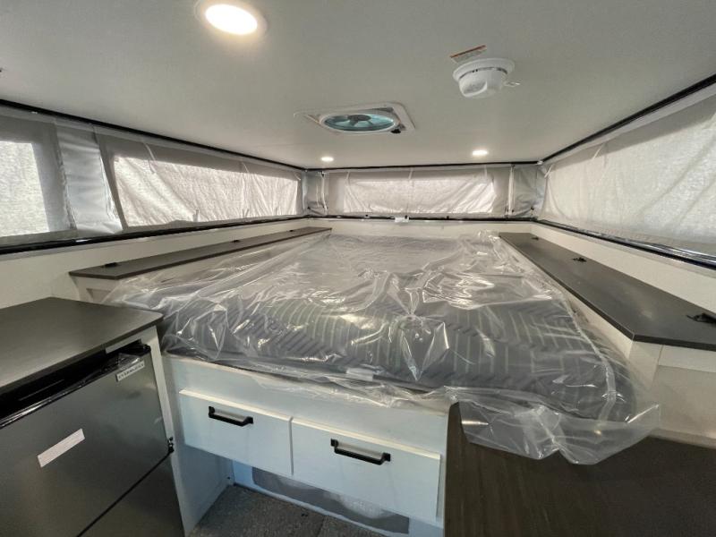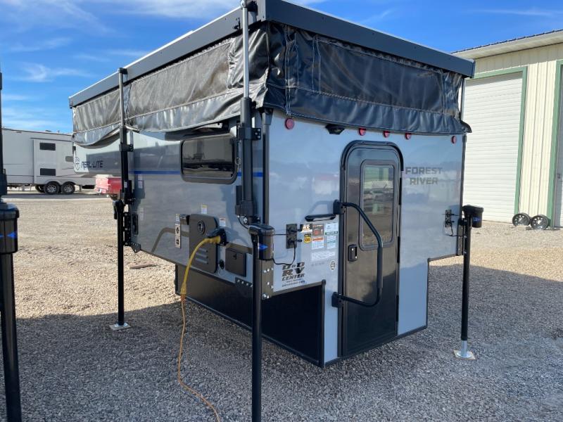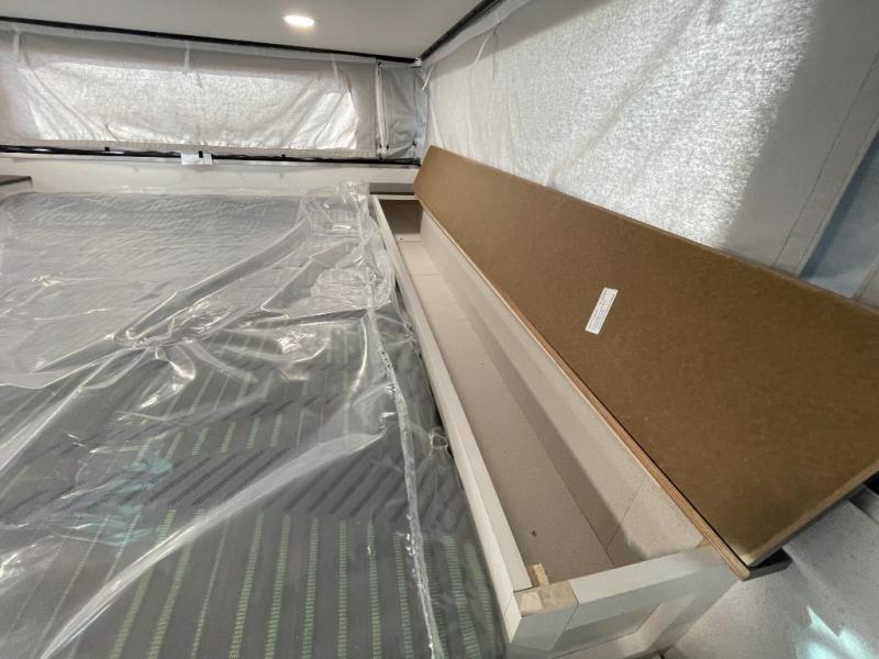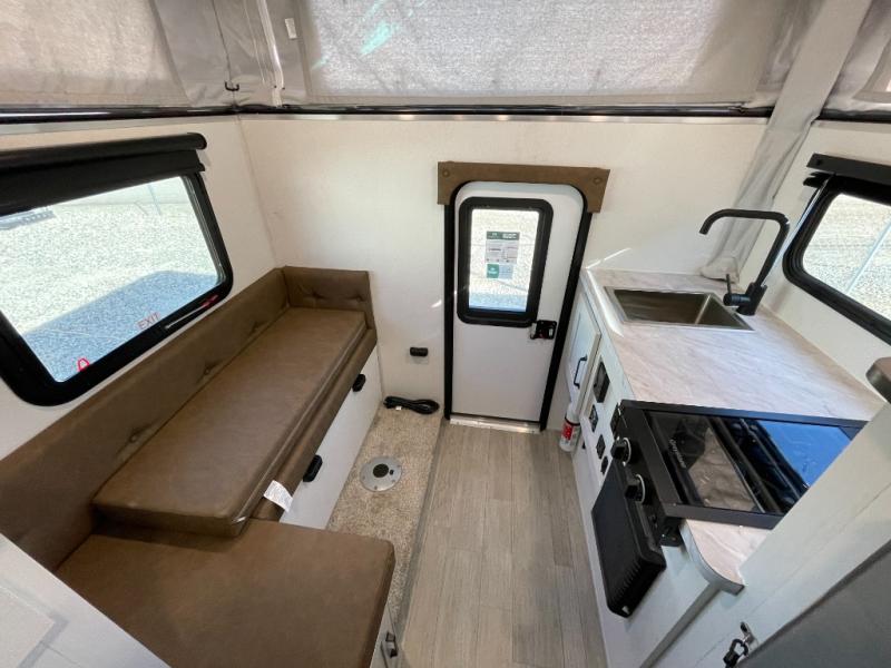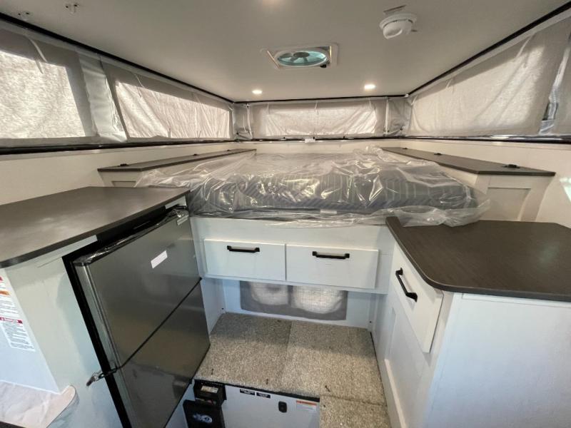 Grab your honey and head to your favorite camping spot in this cozy truck camper. If you have a 1/2-ton truck with a 5' 6" bed up to an 8' bed, it'll be perfect for you. The two-burner cooktop allows you to cook your own meals each day, and the 12V refrigerator can store your perishables. There is a U-shaped dinette for two to three people and a wardrobe to store your clothes. This model also includes two foot lockers on either side of the queen bed for your book, phone, or valuables!
