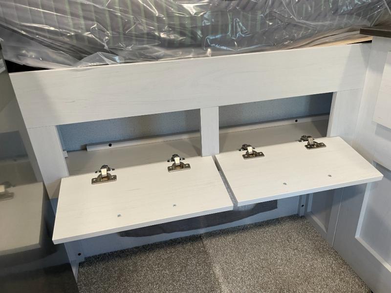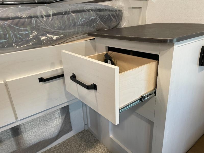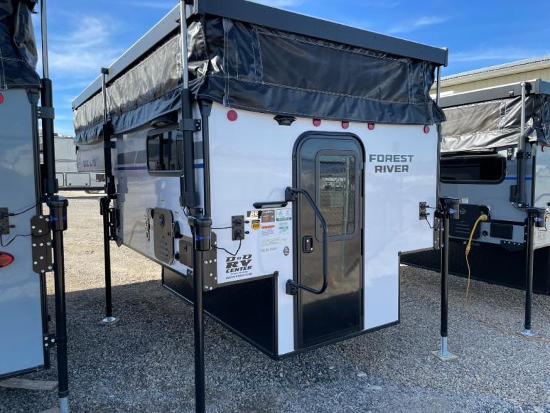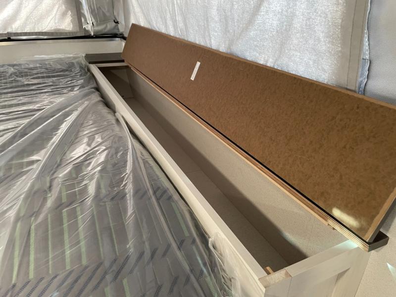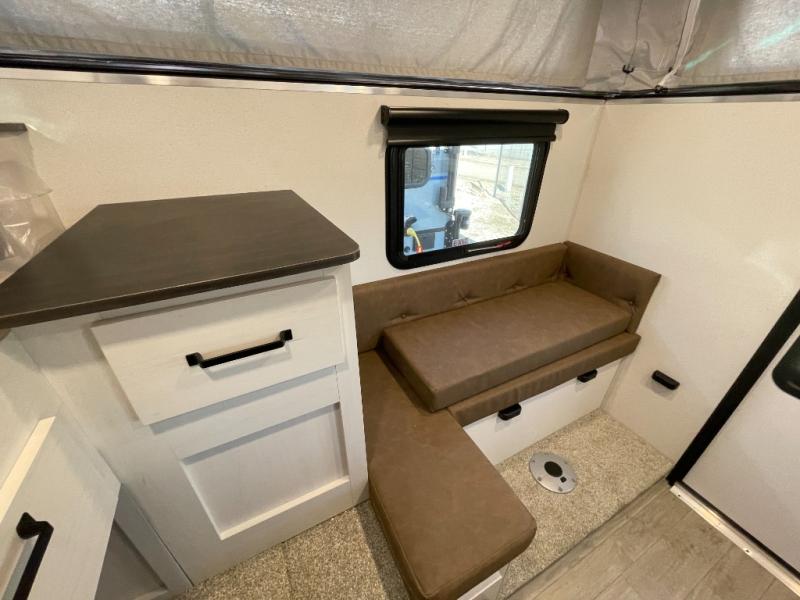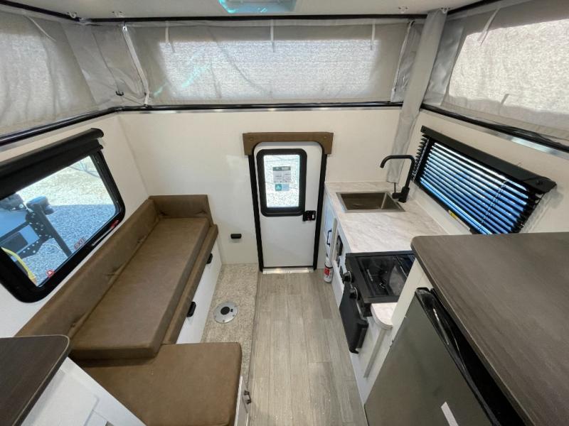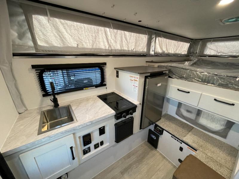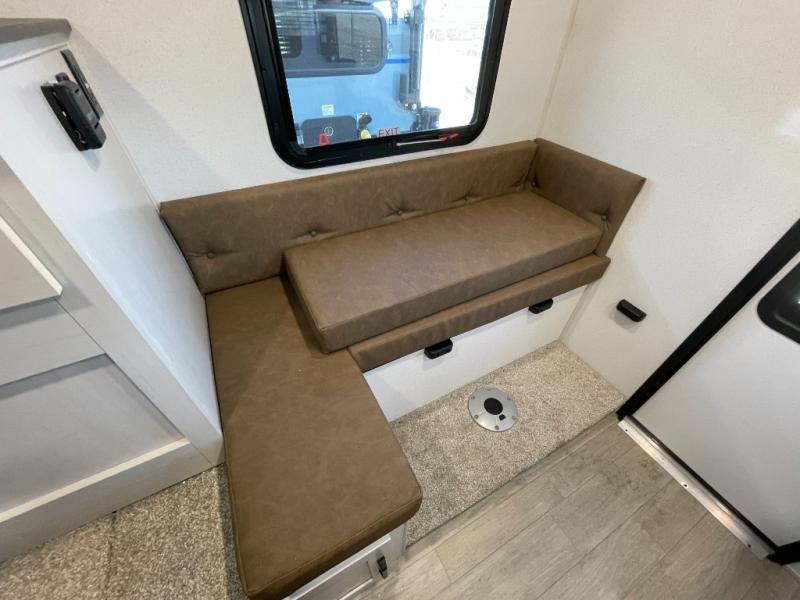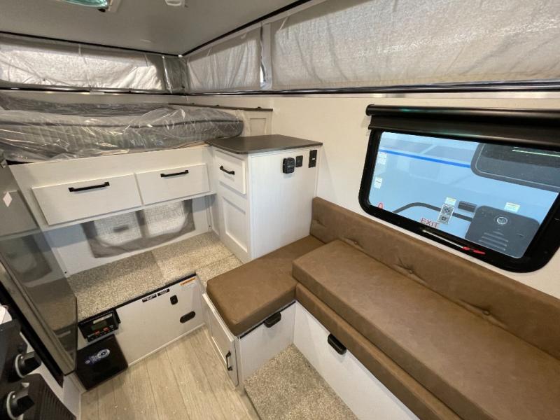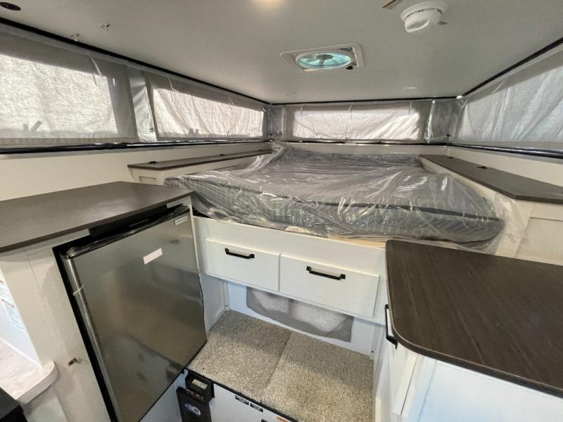 Grab your honey and head to your favorite camping spot in this cozy truck camper. If you have a 1/2-ton truck with a 5' 6" bed up to an 8' bed, it'll be perfect for you. The two-burner cooktop allows you to cook your own meals each day, and the 12V refrigerator can store your perishables. There is a U-shaped dinette for two to three people and a wardrobe to store your clothes. This model also includes two foot lockers on either side of the queen bed for your book, phone, or valuables!