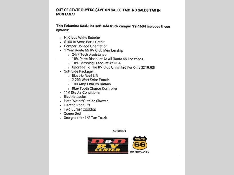 This Palomino Real-Lite soft side truck camper SS-1604 includes these options: