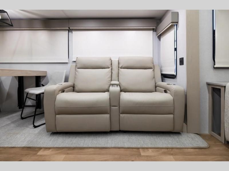 This spacious fifth wheel with four slide outs and an 42' 7" exterior length is sure to meet all your needs! Your crew can relax in the rear living area on the sofa/sleeper or the theater seat across from the fireplace and 50" TV. There is also a free-standing table with chairs with an extension where you can dine at, plus a kitchen island for more counter space in the kitchen. There is a spacious full bath with dual bath sinks so you both can get ready at the same time, and the front private bedroom will provide you with your own space in the evenings. Here, you'll find a king bed and wardrobe slide, a second wardrobe, and washer/dryer prep with a removable shelf for more storage space. Head outdoors to enjoy the two power awnings, and you can grab your hiking gear from the rear slide tray!