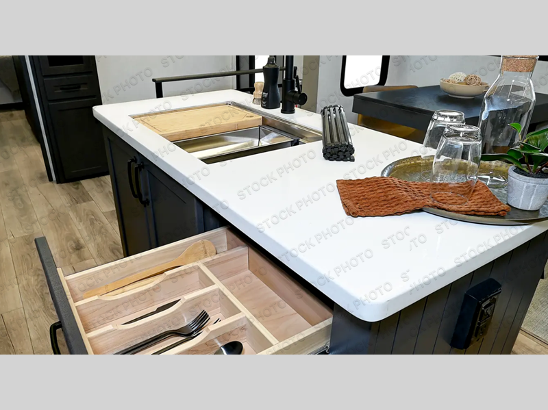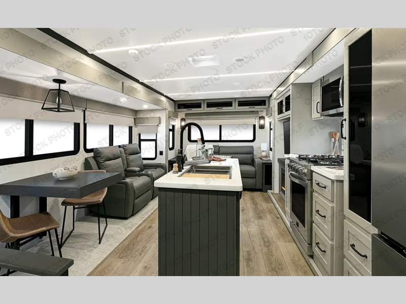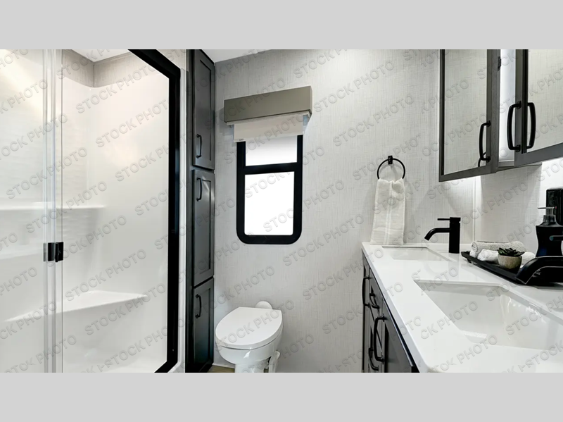 This spacious fifth wheel with four slide outs and an 42' 7" exterior length is sure to meet all your needs! Your crew can relax in the rear living area on the sofa/sleeper or the theater seat across from the fireplace and 50" TV. There is also a free-standing table with chairs with an extension where you can dine at, plus a kitchen island for more counter space in the kitchen. There is a spacious full bath with dual bath sinks so you both can get ready at the same time, and the front private bedroom will provide you with your own space in the evenings. Here, you'll find a king bed and wardrobe slide, a second wardrobe, and washer/dryer prep with a removable shelf for more storage space. Head outdoors to enjoy the two power awnings, and you can grab your hiking gear from the rear slide tray!