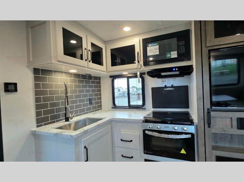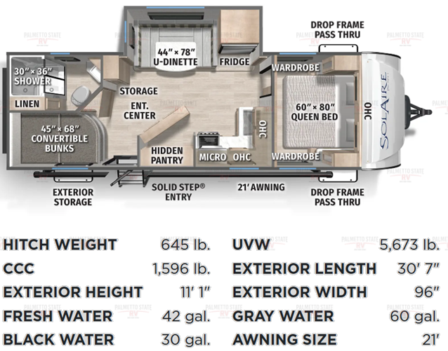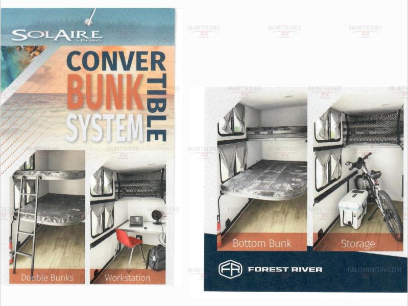Each SolAire travel trailer by Palomino features a white gel coat exterior and an aluminum superstructure frame for lightweight towing. You will love having a power tongue jack for easy set up, plus slam latch baggage doors with magnets to make unloading easier than ever. There is also a power awning with LED lights and aluminum wheels included on the exterior. Each SolAire is constructed to last with Azdel composite, a fully laminated rear wall and roof, plus a fully enclosed and heated underbelly. The interior includes roller shades and kitchen backsplash, USB ports to keep your electronics charged, a Bluetooth stereo with speakers, and many more stand-out features!