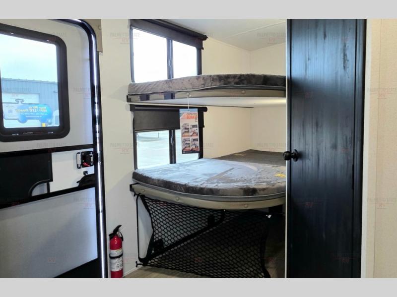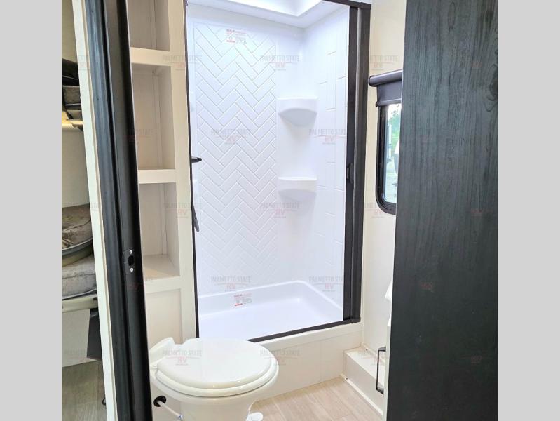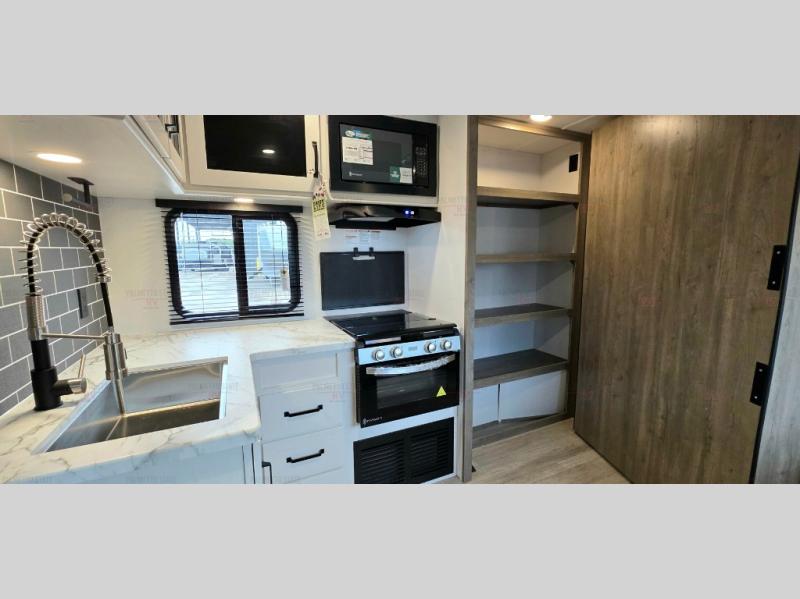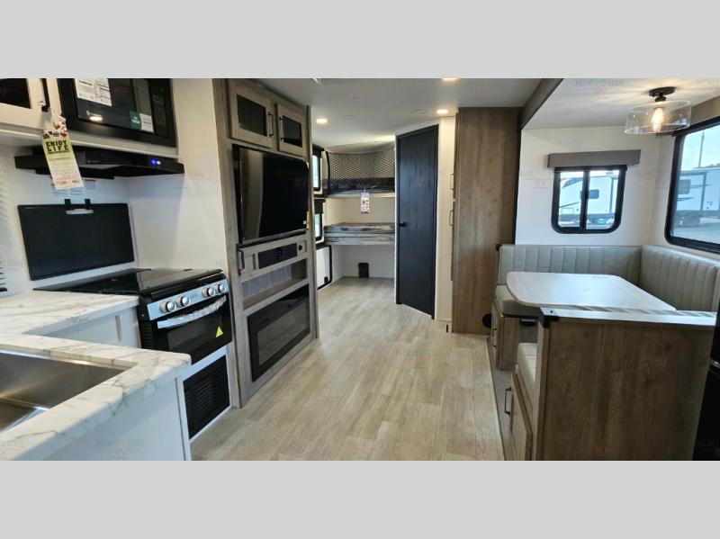 Your friends and family will love camping with you in this trailer that offers sleeping space for eight with the queen bed, the double-size bunks and the U-shaped dinette once it is easily set up for sleeping space. The cook will love the full kitchen with its cooktop, microwave, electric refrigerator plus hidden pantry behind the entertainment center. A full bath with a 30" x 36" shower will let you freshen up each day, and you'll love having your own space in the front private bedroom!