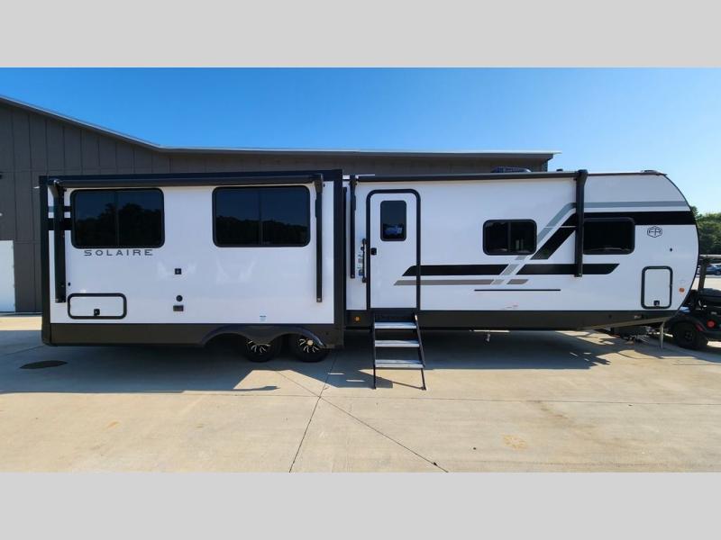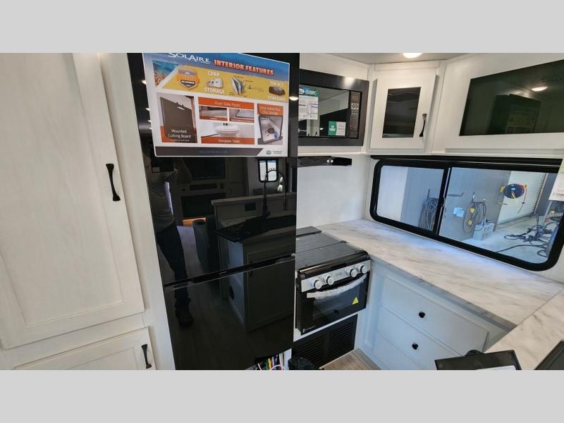 Each SolAire travel trailer by Palomino features a white gel coat exterior and an aluminum superstructure frame for lightweight towing. You will love having a power tongue jack for easy set up, plus slam latch baggage doors with magnets to make unloading easier than ever. There is also a power awning with LED lights and aluminum wheels included on the exterior. Each SolAire is constructed to last with Azdel composite, a fully laminated rear wall and roof, plus a fully enclosed and heated underbelly. The interior includes roller shades and kitchen backsplash, USB ports to keep your electronics charged, a Bluetooth stereo with speakers, and many more stand-out features!