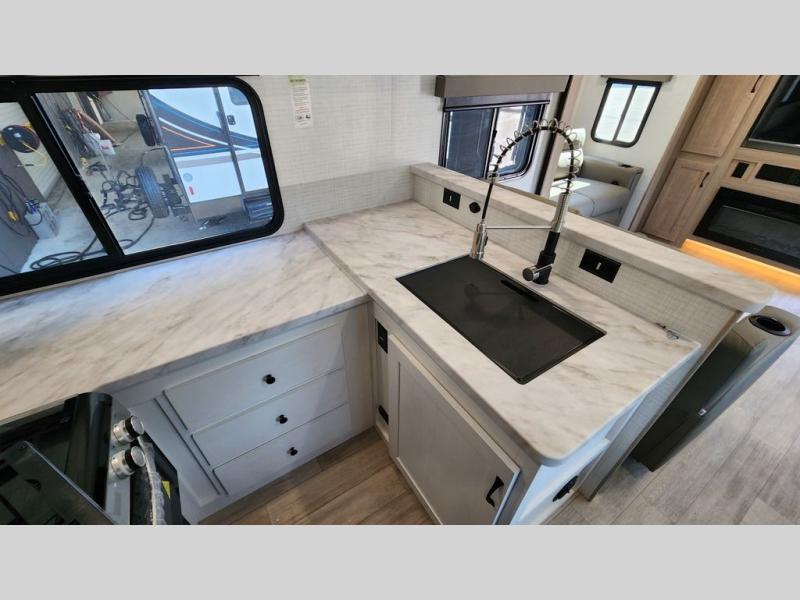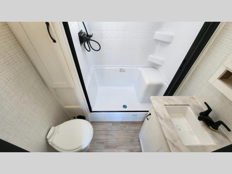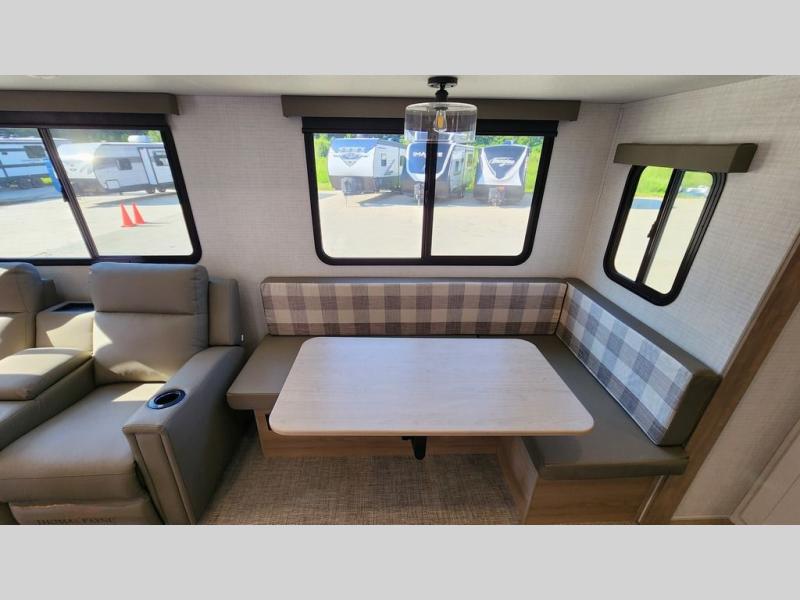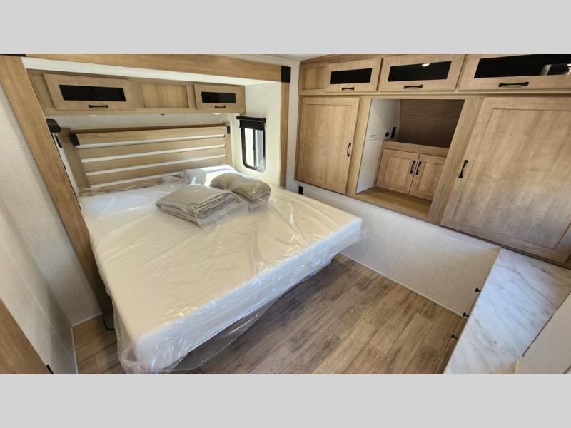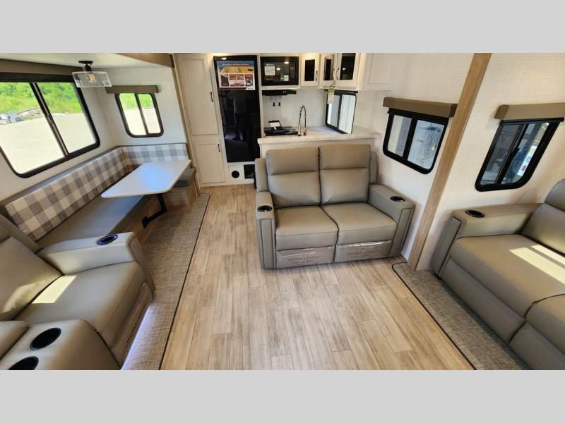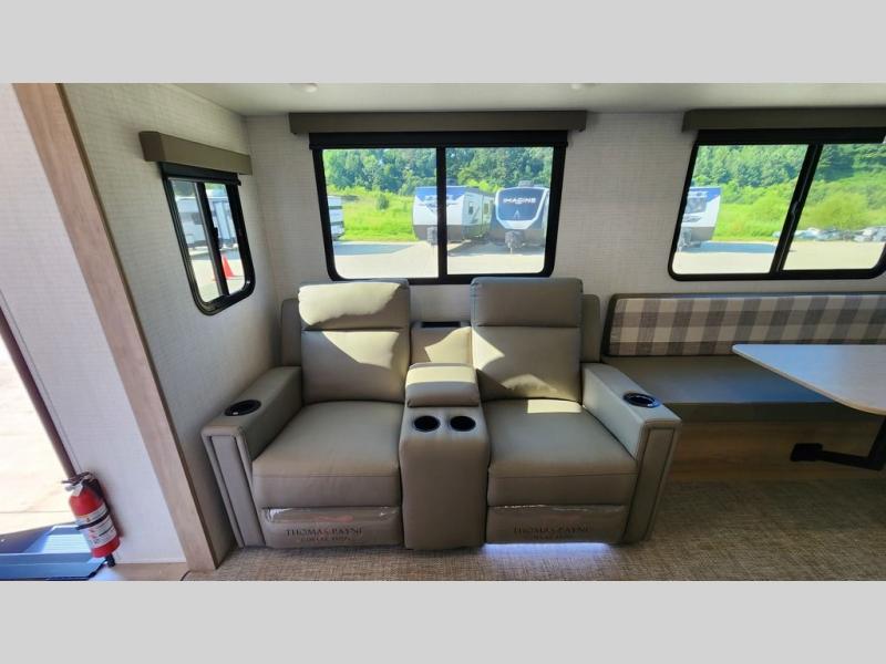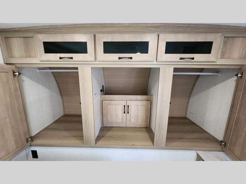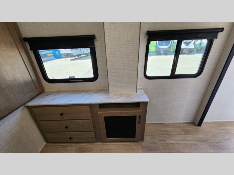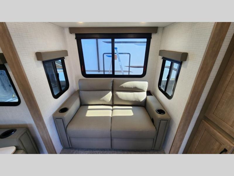 One look at this spacious travel trailer and you'll be sold! The rear kitchen features a U-shaped counter, an 11 cu. ft. refrigerator, plus a pantry for dry goods and snacks. There is a 1/2 dinette with bench seating, plus a tri-fold sofa and two theater seats. Everyone can take turns cleaning up in the full bath that includes a shower with a seat, then head outdoors to relax under the patio awnings with LED lights. When it's time for bed, you will enjoy the king bed slide out in the front bedroom. You'll also find a dresser and a closet here, plus a wardrobe with washer and dryer prep if you choose to add those appliances!