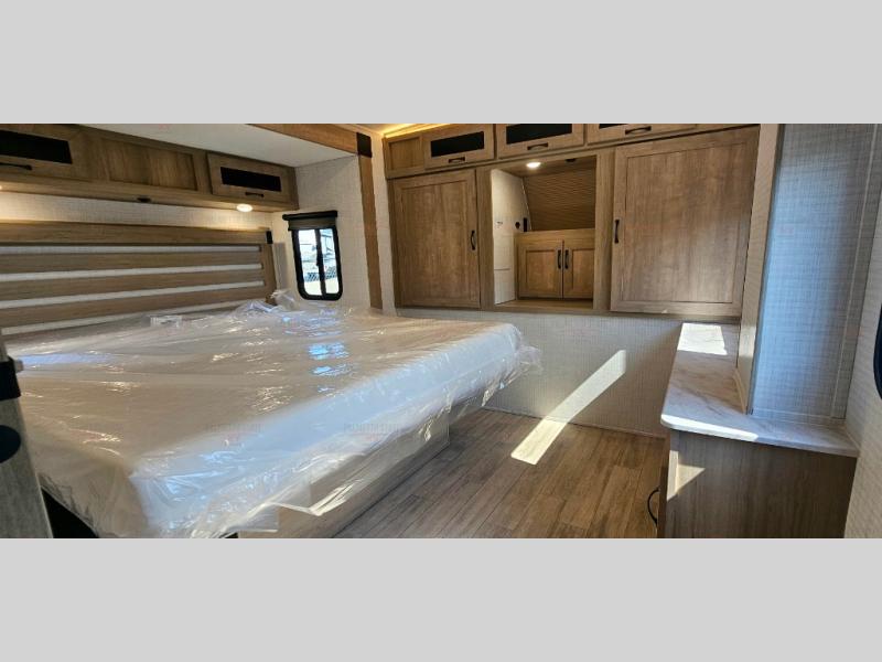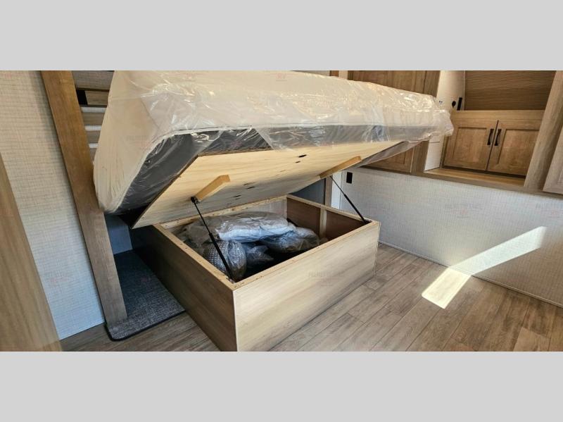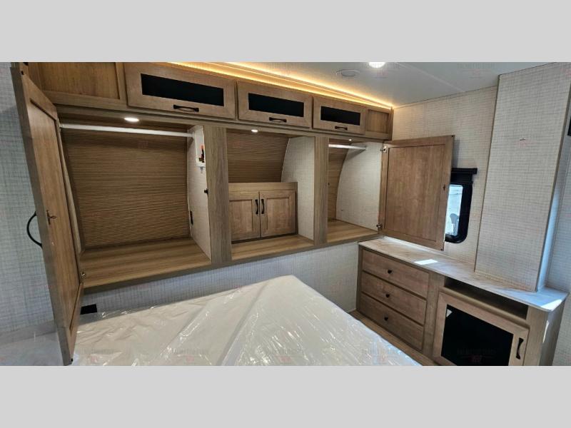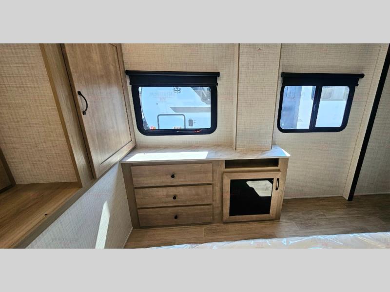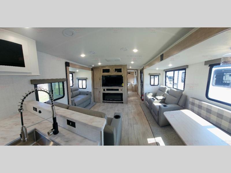 One look at this spacious travel trailer and you'll be sold! The rear kitchen features a U-shaped counter, an 11 cu. ft. refrigerator, plus a pantry for dry goods and snacks. There is a 1/2 dinette with bench seating, plus a tri-fold sofa and two theater seats. Everyone can take turns cleaning up in the full bath that includes a shower with a seat, then head outdoors to relax under the patio awnings with LED lights. When it's time for bed, you will enjoy the king bed slide out in the front bedroom. You'll also find a dresser and a closet here, plus a wardrobe with washer and dryer prep if you choose to add those appliances!