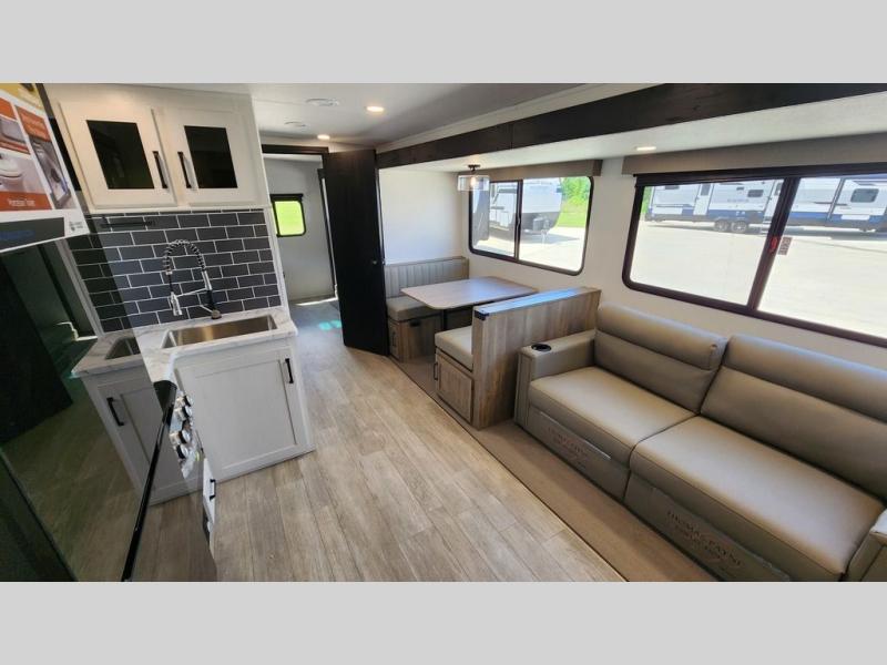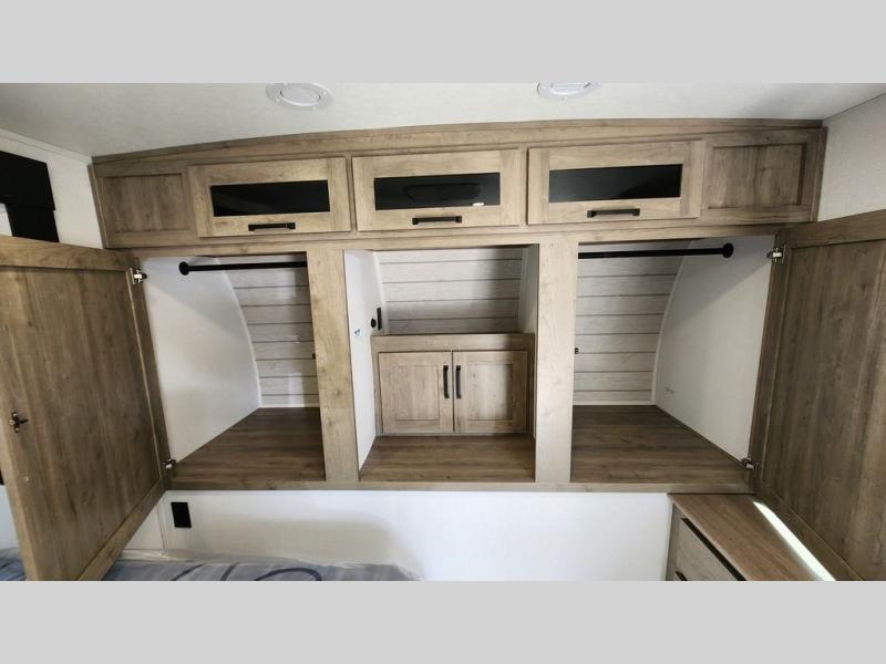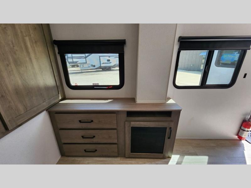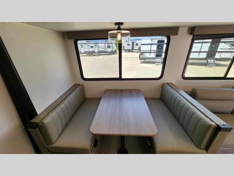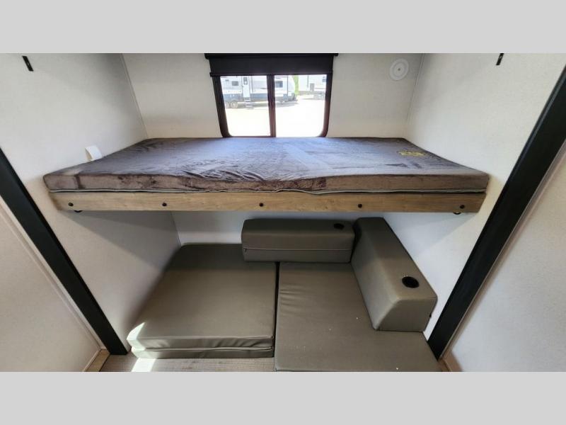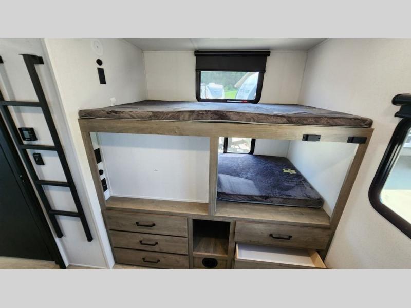 This travel trailer offers so many features that you will love, from a private bunkhouse for overnight guests to having three slide outs giving you a spacious interior throughout! The bunkhouse includes triple bunks, a double-size day bed, and storage space for your guests' things. The full bathroom is centrally located for all to access from the main living and kitchen area where you will find a slide out that includes a booth dinette and a sofa sleeper. The cook will love the kitchen amenities such as the microwave, cooktop, 11 cu. ft. refrigerator, and the L-shaped counter for preparing and serving meals. And don't overlook the front private bedroom with its king bed slide out, dresser, closet, plus a second bedroom closet with washer and dryer prep!