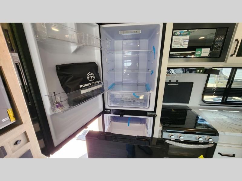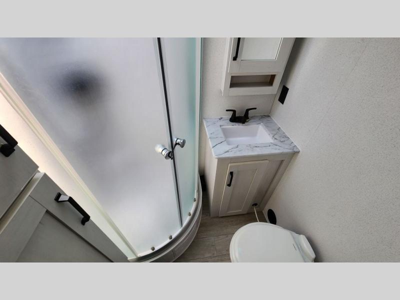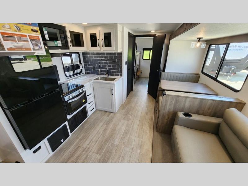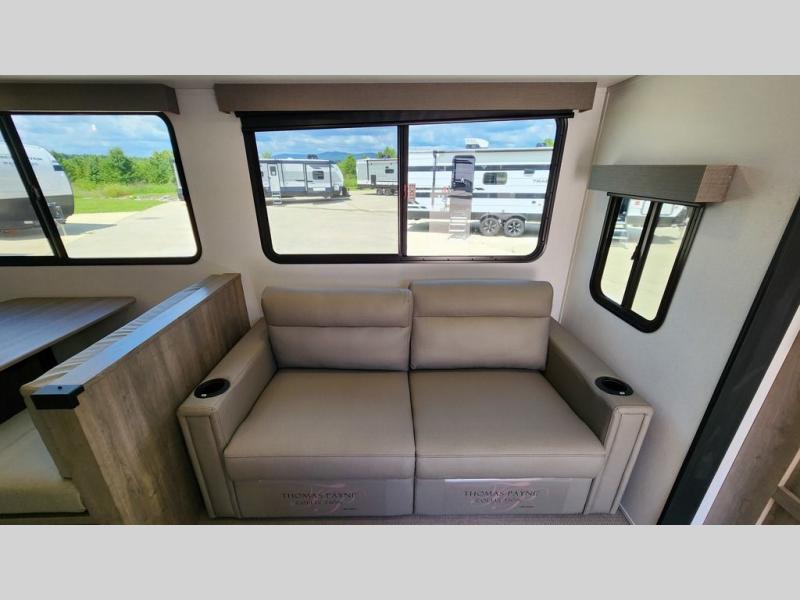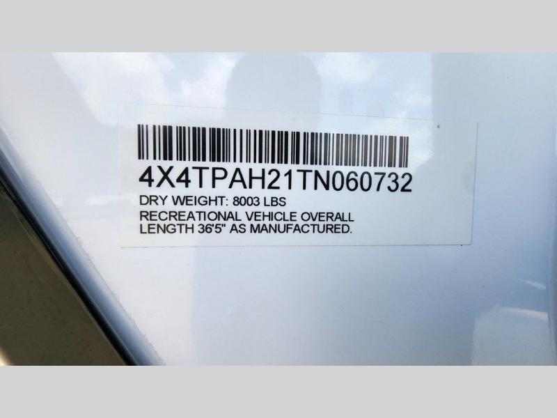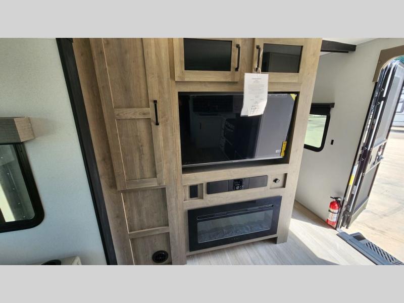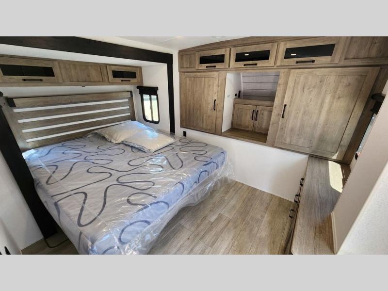 This travel trailer offers so many features that you will love, from a private bunkhouse for overnight guests to having three slide outs giving you a spacious interior throughout! The bunkhouse includes triple bunks, a double-size day bed, and storage space for your guests' things. The full bathroom is centrally located for all to access from the main living and kitchen area where you will find a slide out that includes a booth dinette and a sofa sleeper. The cook will love the kitchen amenities such as the microwave, cooktop, 11 cu. ft. refrigerator, and the L-shaped counter for preparing and serving meals. And don't overlook the front private bedroom with its king bed slide out, dresser, closet, plus a second bedroom closet with washer and dryer prep!