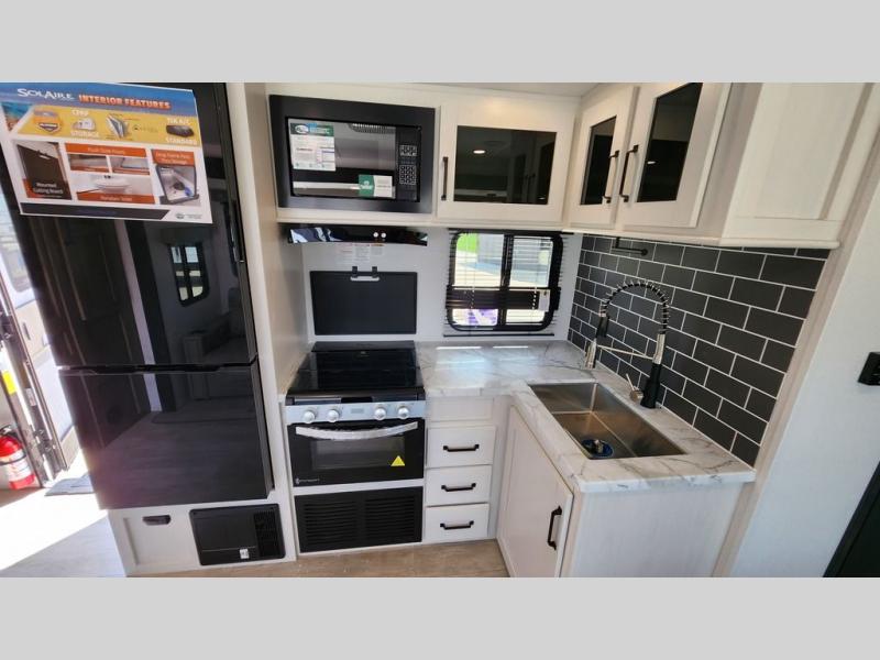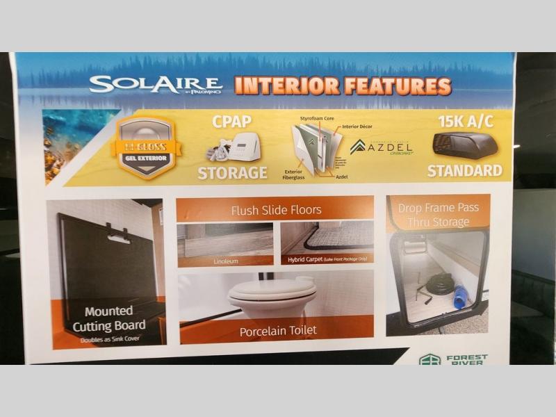Each SolAire travel trailer by Palomino features a white gel coat exterior and an aluminum superstructure frame for lightweight towing. You will love having a power tongue jack for easy set up, plus slam latch baggage doors with magnets to make unloading easier than ever. There is also a power awning with LED lights and aluminum wheels included on the exterior. Each SolAire is constructed to last with Azdel composite, a fully laminated rear wall and roof, plus a fully enclosed and heated underbelly. The interior includes roller shades and kitchen backsplash, USB ports to keep your electronics charged, a Bluetooth stereo with speakers, and many more stand-out features!